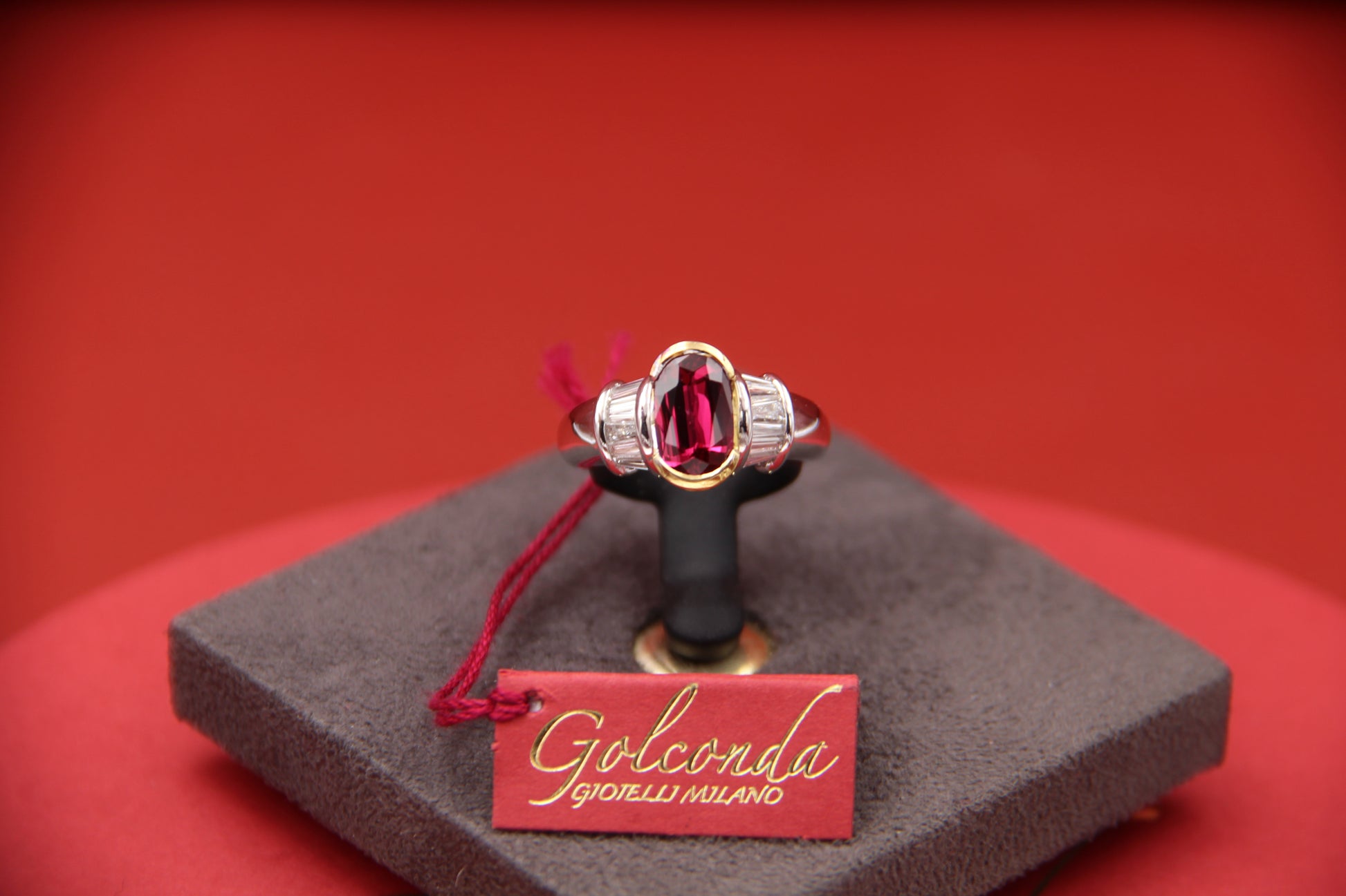 - Gems : natural tapered cut diamonds for a total of 0.80 ct, G color, VS clarity and a central natural oval cut ruby weighing 2.20 ct.