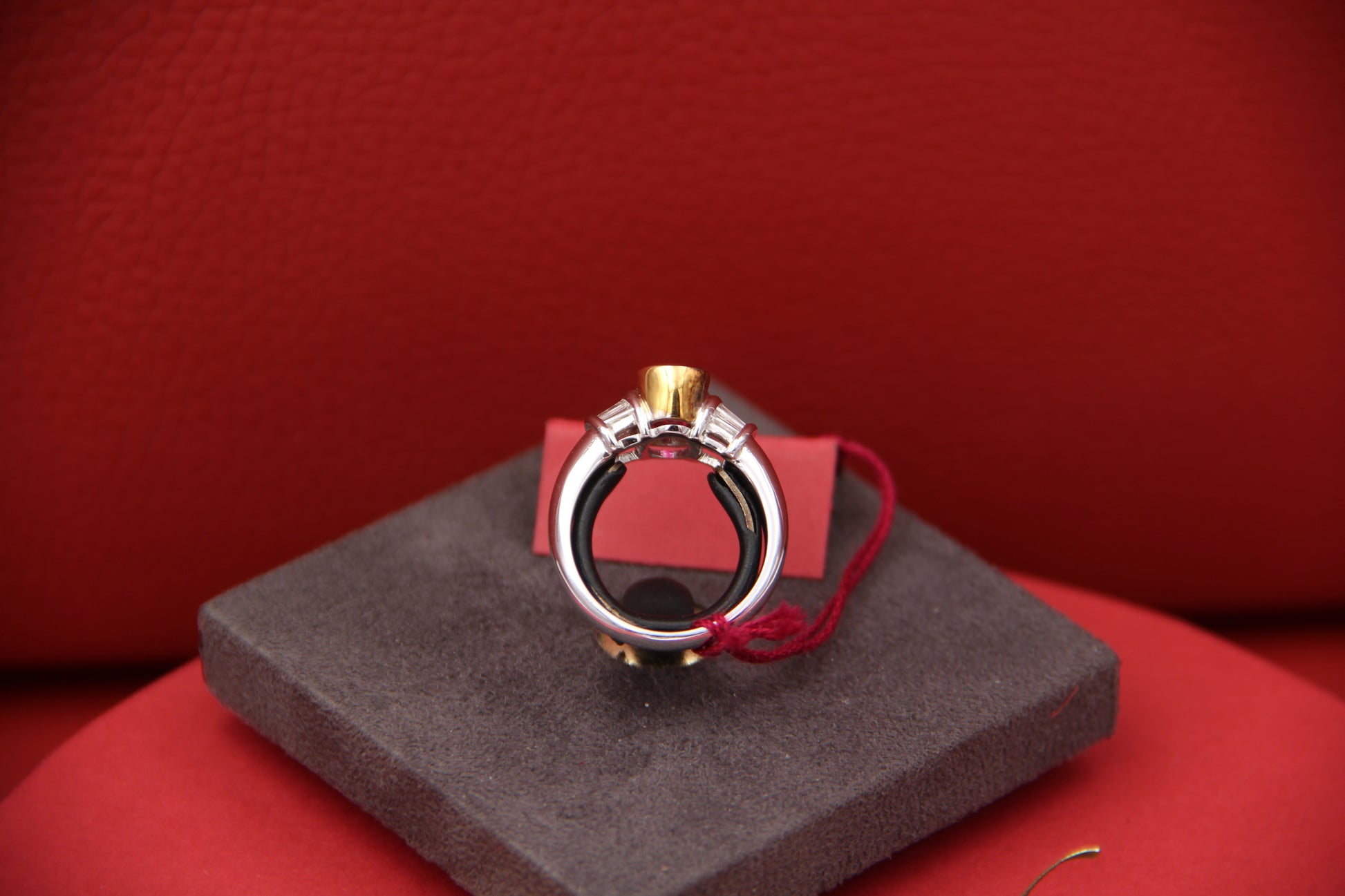 Vintage 18k yellow and white gold ring, 9.60 g, with a 2.20 ct oval-cut natural ruby flanked by 0.80 ct baguette-cut diamonds. Size: ∅ 14 Era: vintage