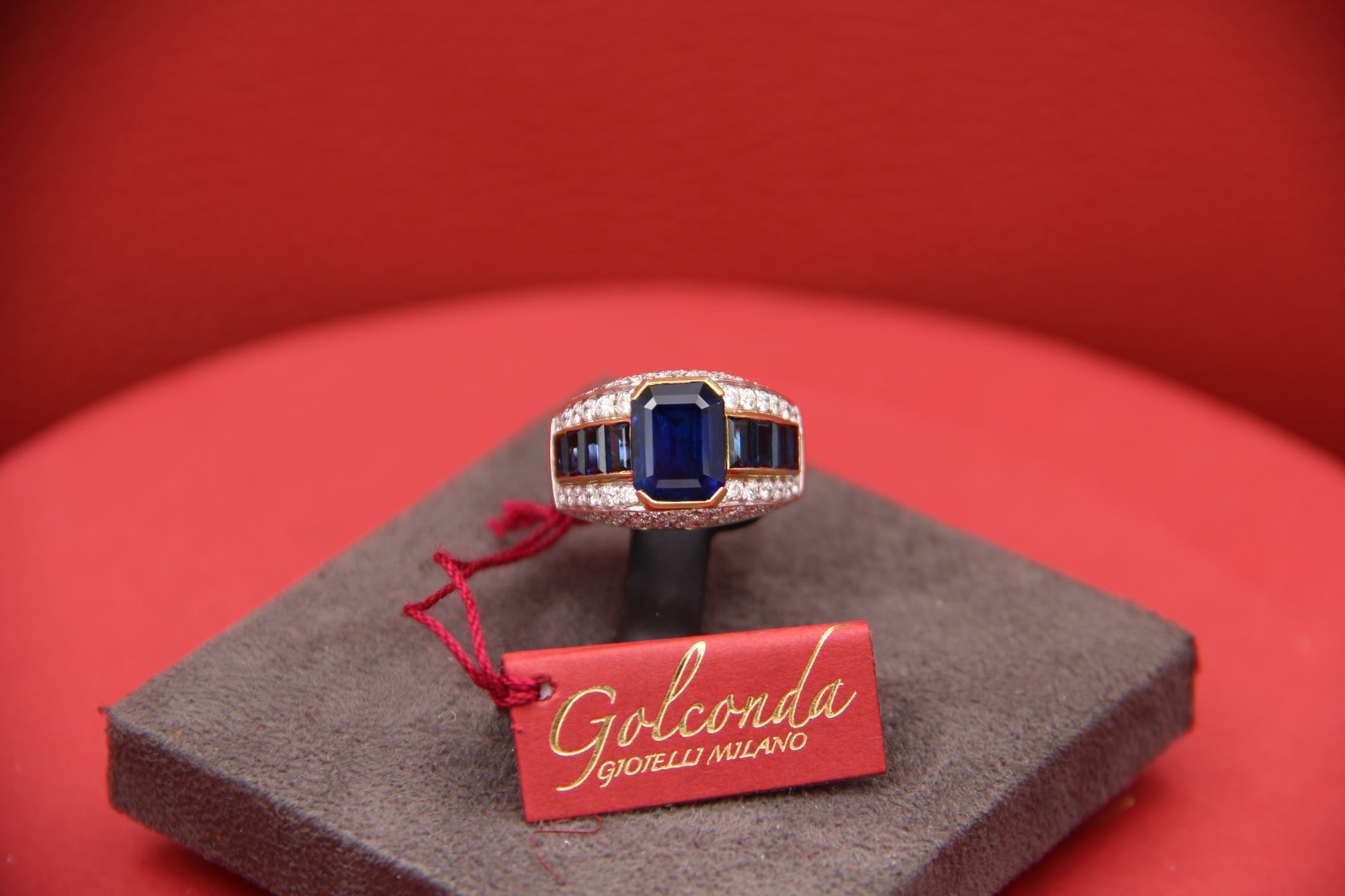 Vintage ring in 18k yellow gold, 9.80 grams, with a central heat-resistant emerald-cut sapphire weighing 3 ct, square-cut sapphires weighing 0.80 ct, and brilliant-cut diamonds weighing 1.14 ct.