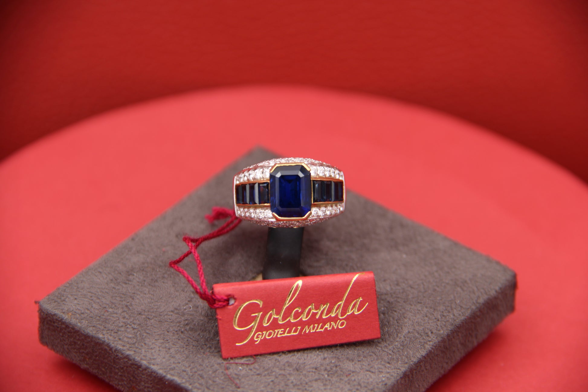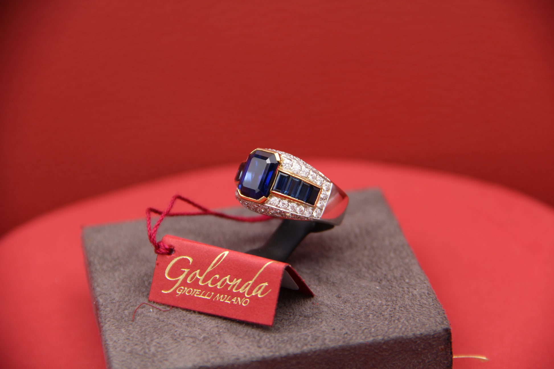 Gems : natural brilliant-cut diamonds for a total of 1.14 ct ~ FG color, VS clarity and a central natural rectangular-cut sapphire with NO HEAT steps weighing 3.00 ct and natural baguette-cut sapphires for 0.80 ct ~ 1.48 x 2.27 cm