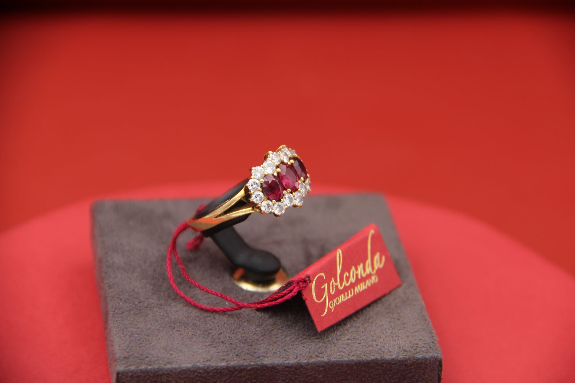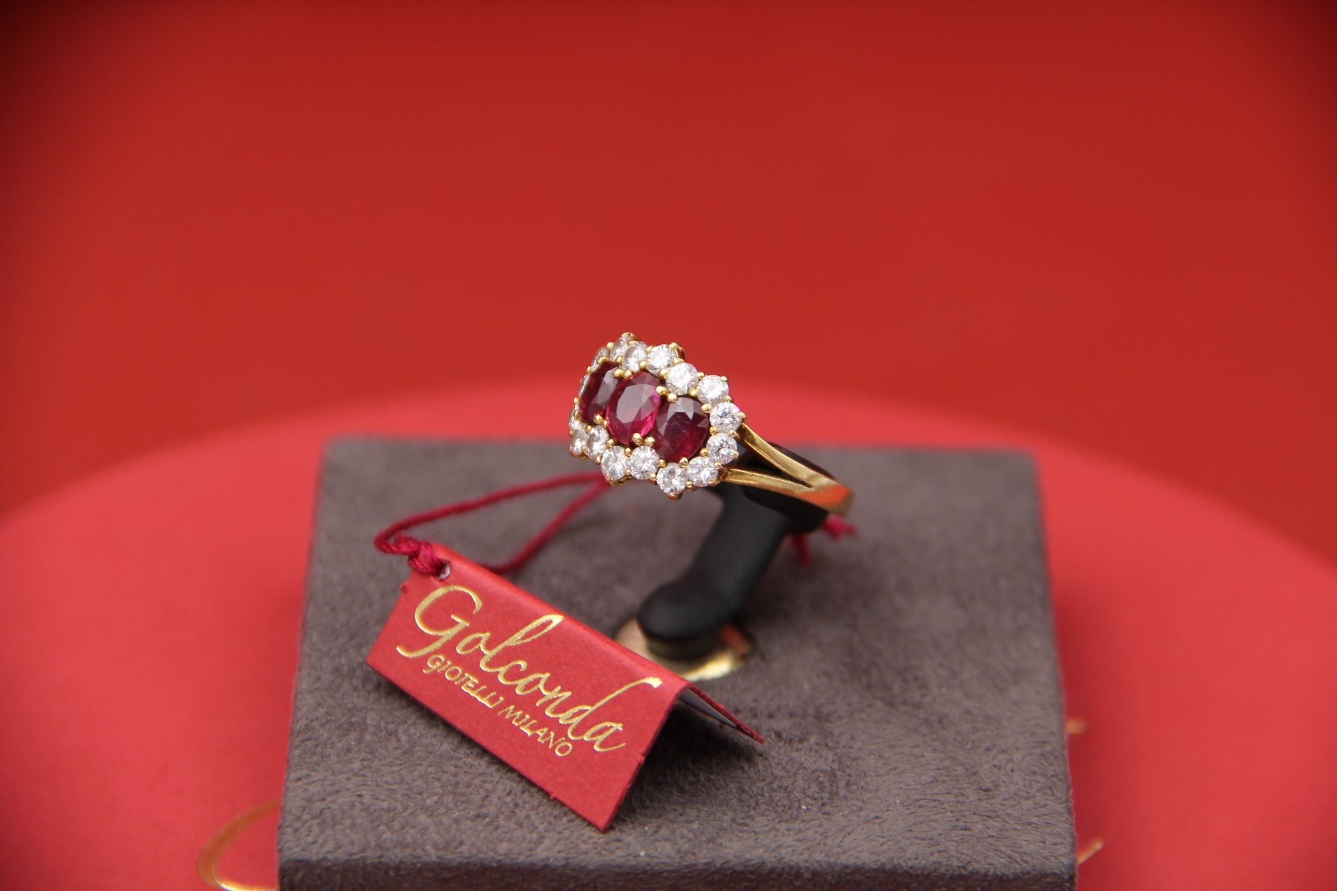 Vintage 18k yellow gold ring, 6.00 g, with three 1.50 ct natural oval-cut rubies and a surrounding brilliant-cut diamond.