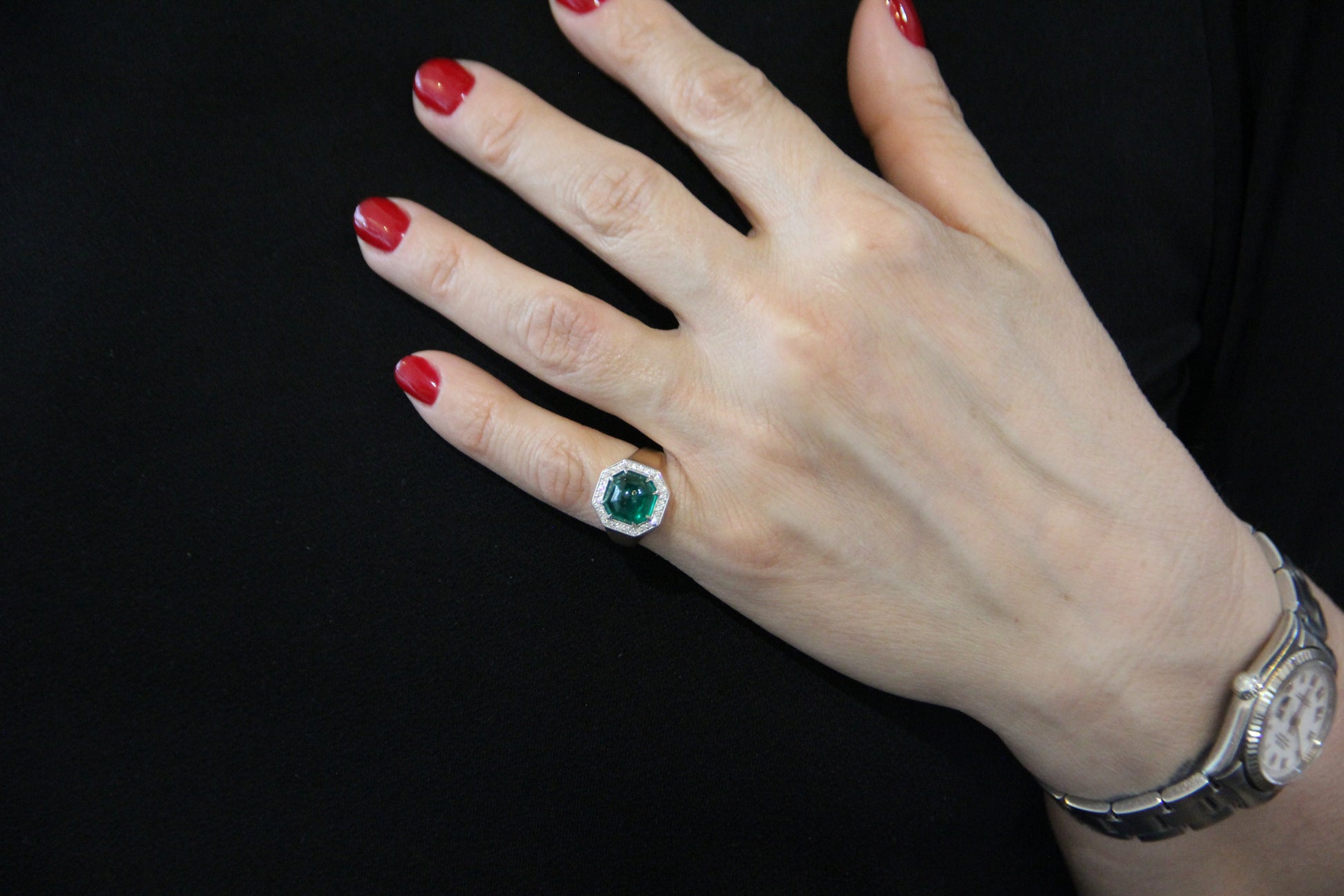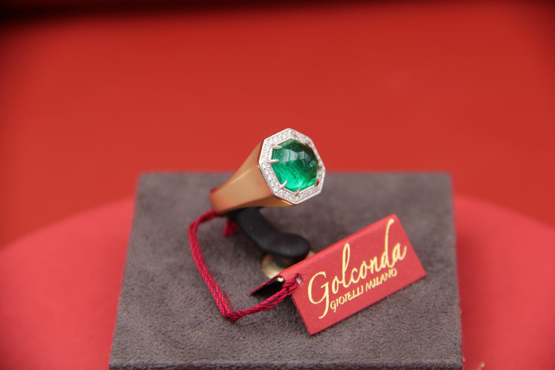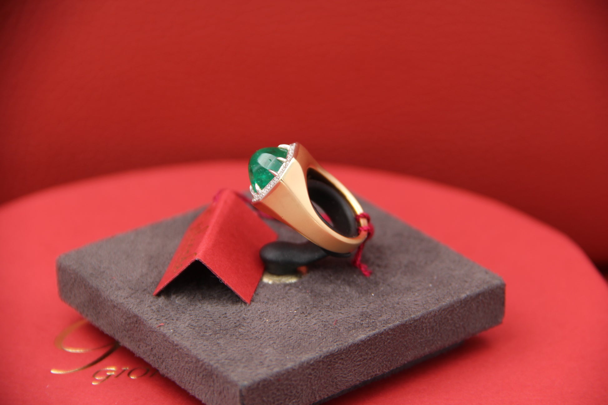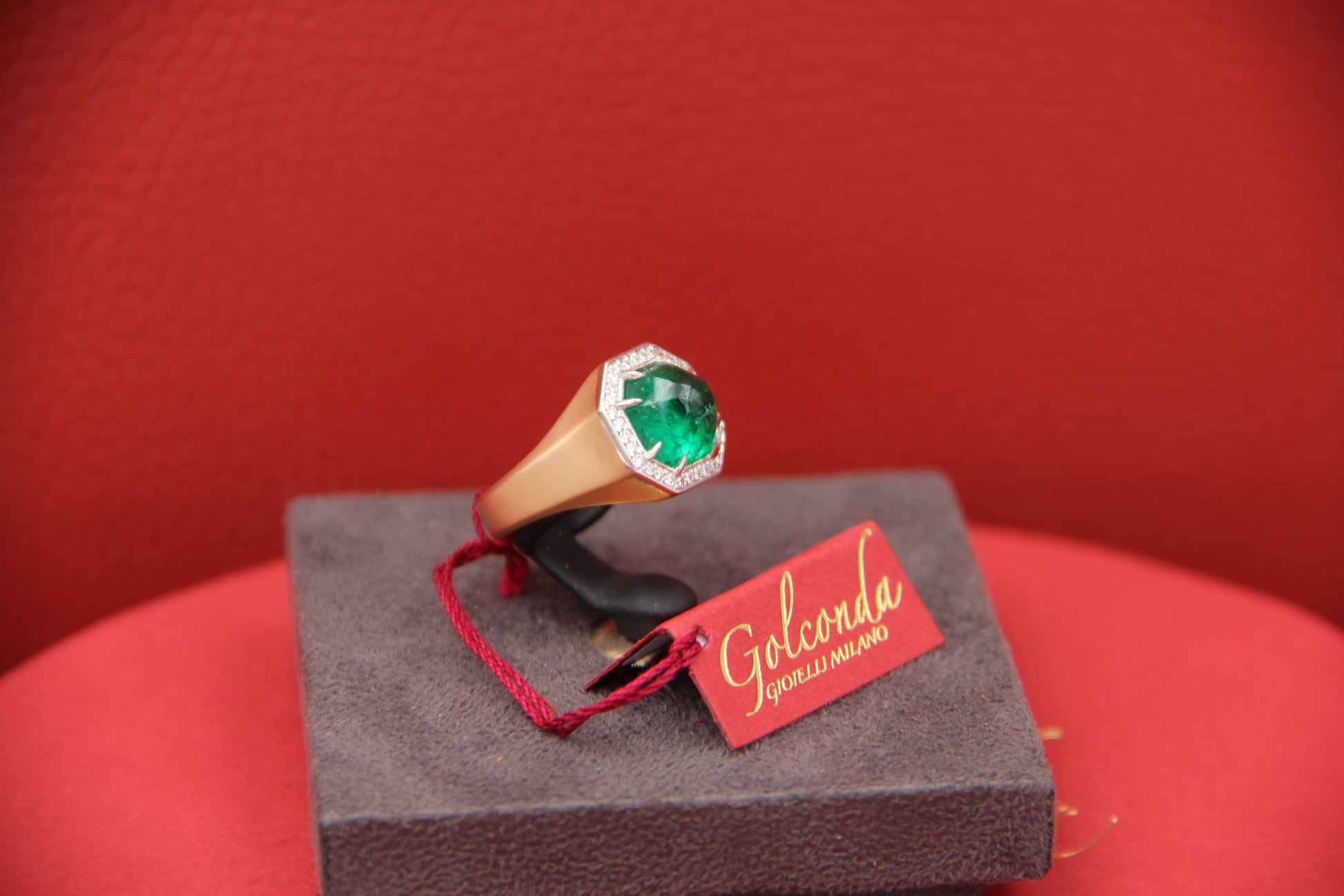 Modern ring in satin-finished 18k rose gold, 8.50 g, with a 3.70 ct natural “sugar loaf” cut emerald and a 0.20 ct brilliant-cut diamond surround.