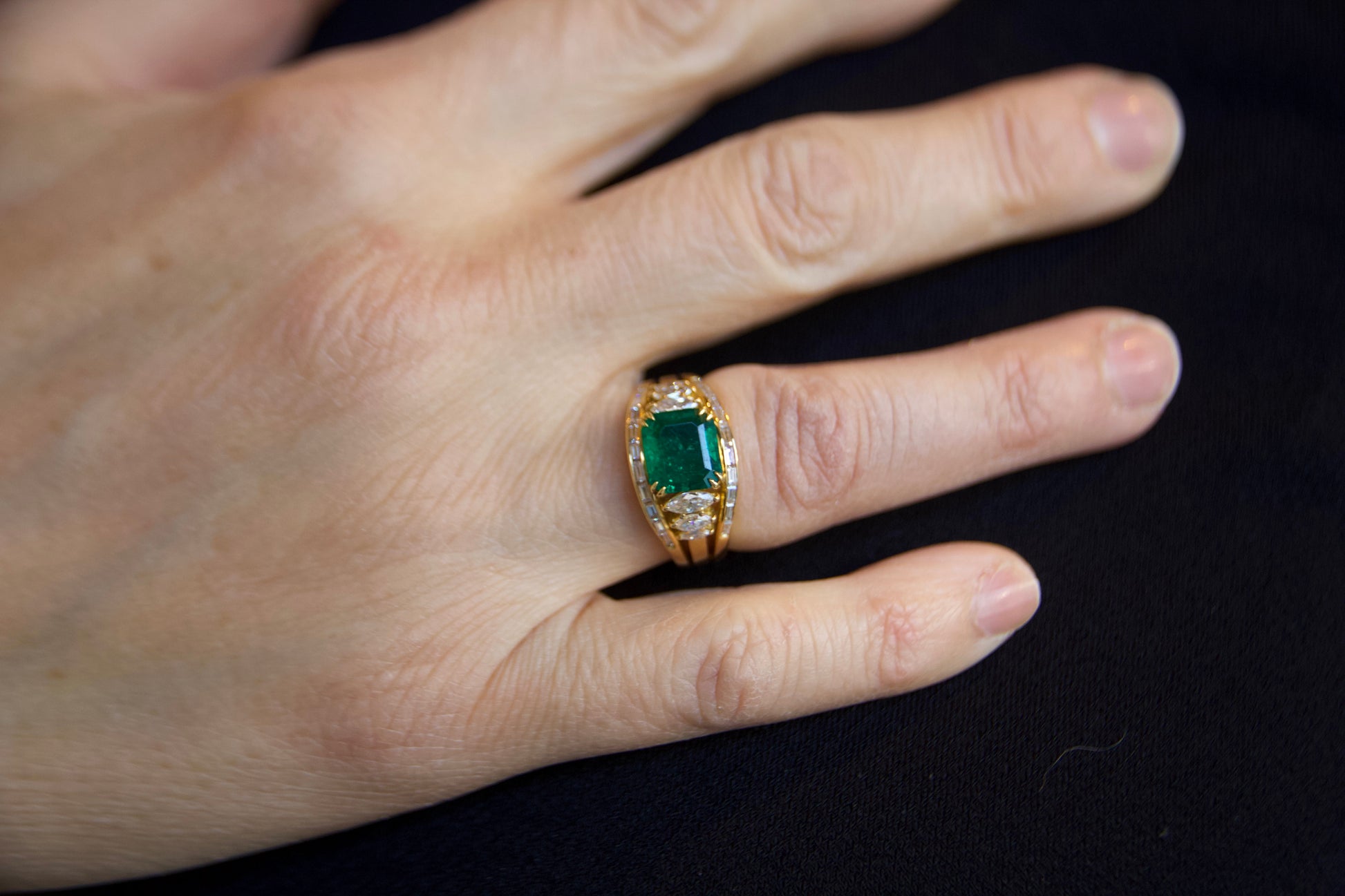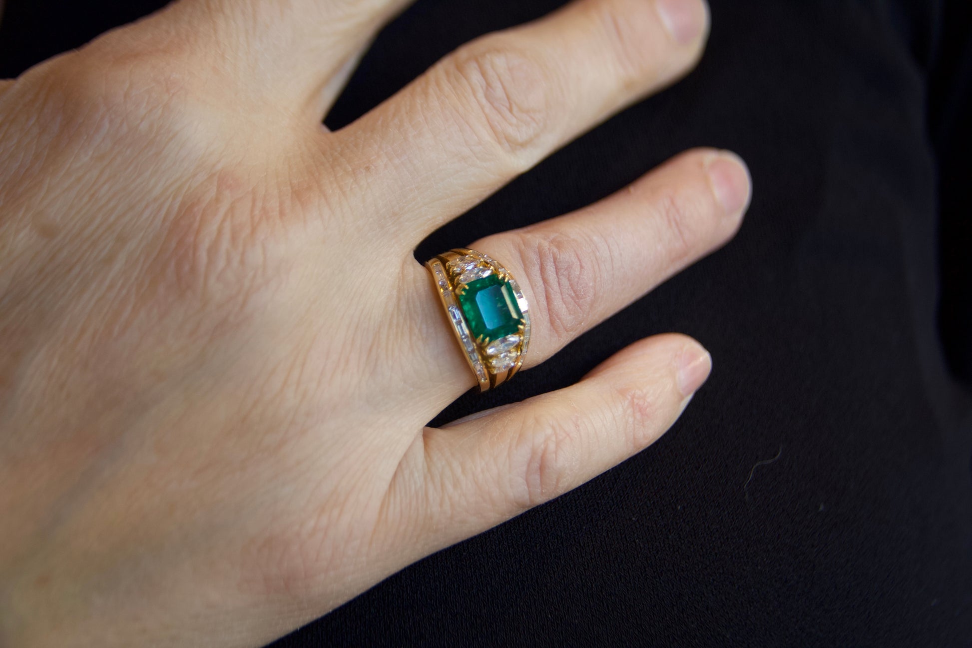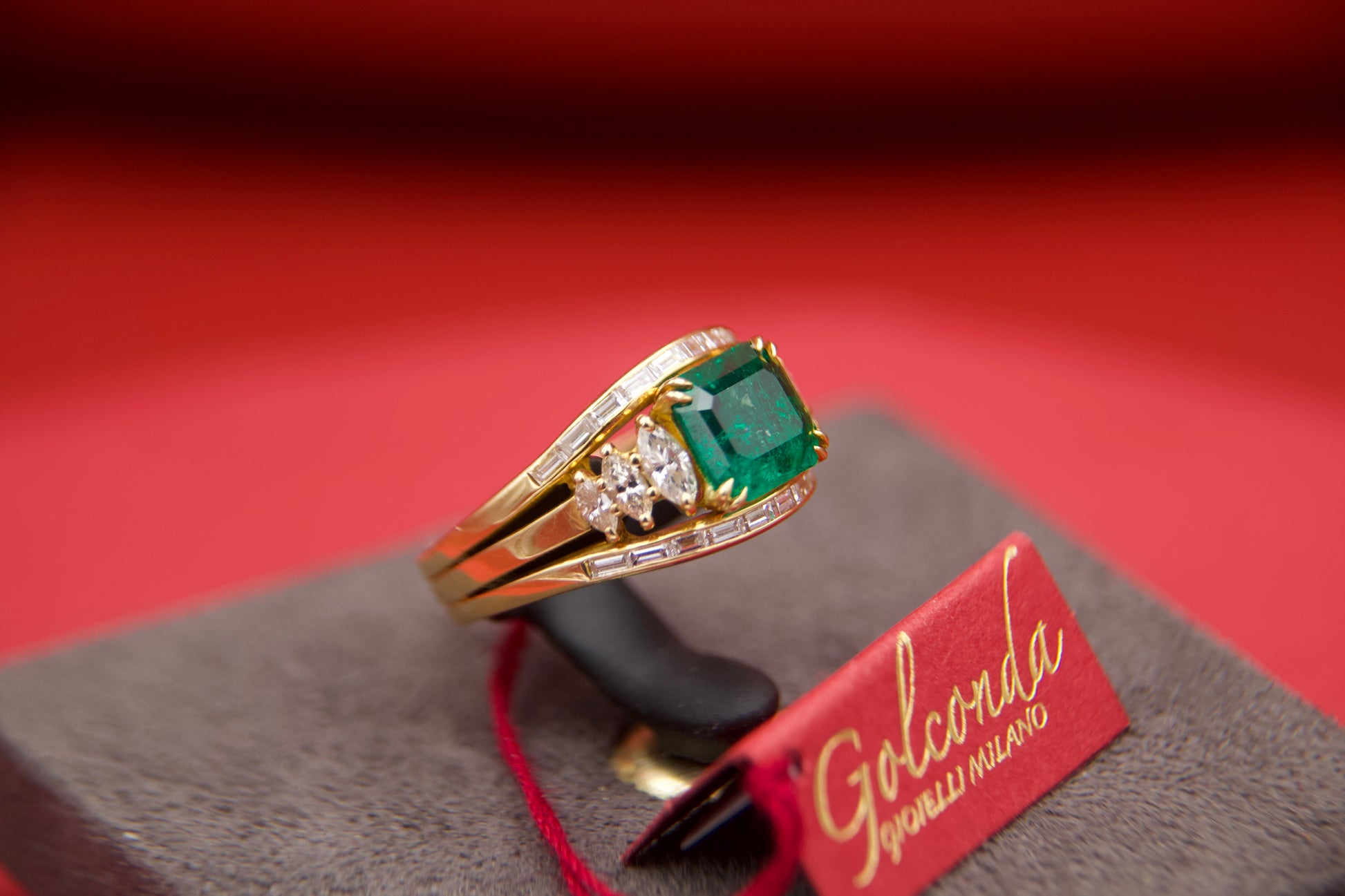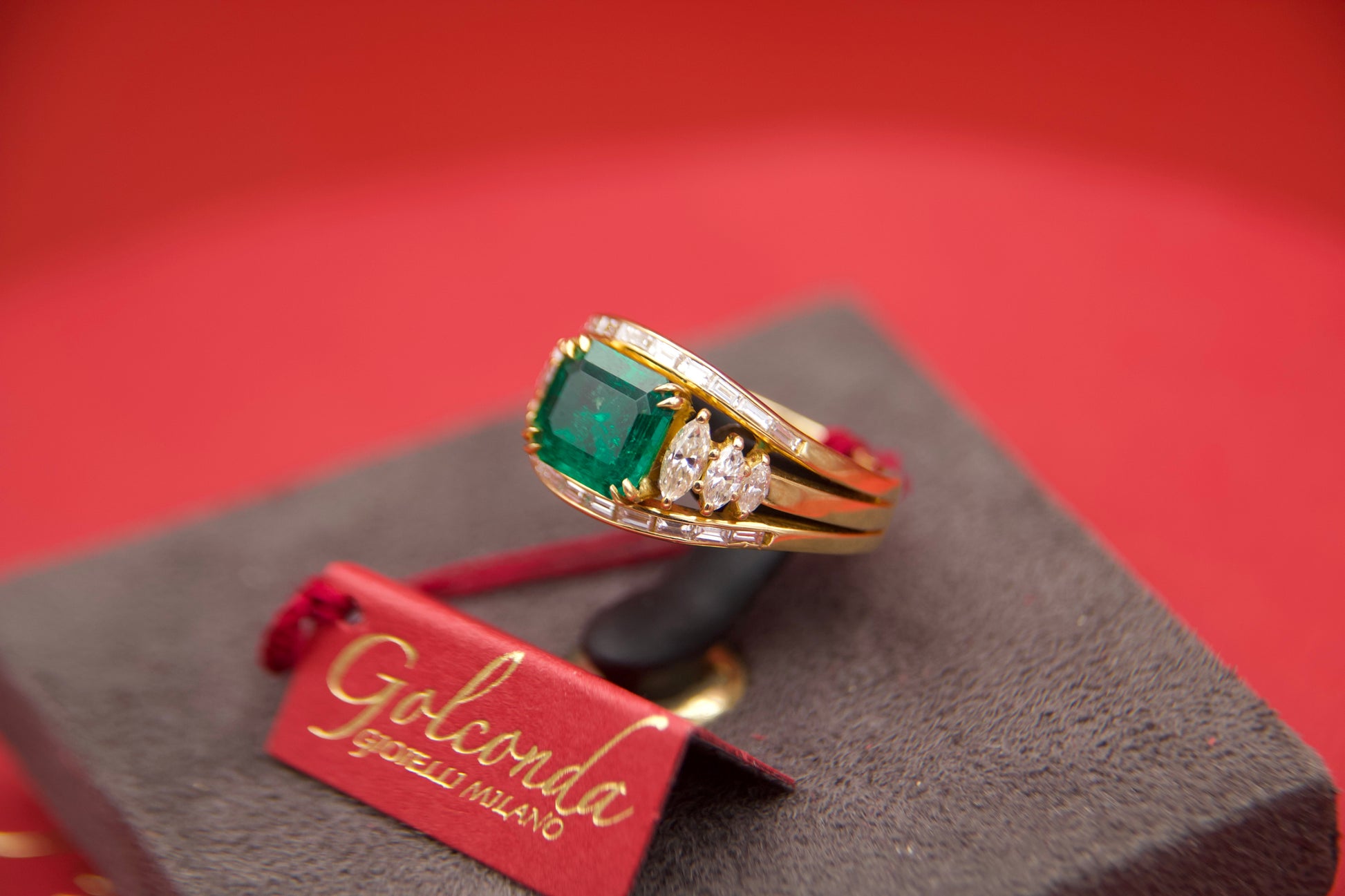 18k yellow gold ring, 9.10g, with a central 1.75ct Colombian emerald and 1.70ct marquise and baguette cut natural diamonds, FG colour, VS clarity. Size: ∅ 16 era: vintage 1960s
