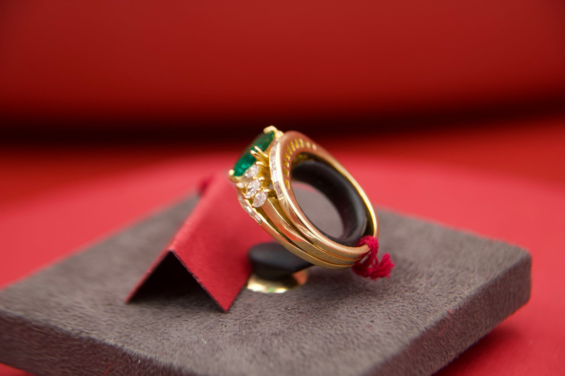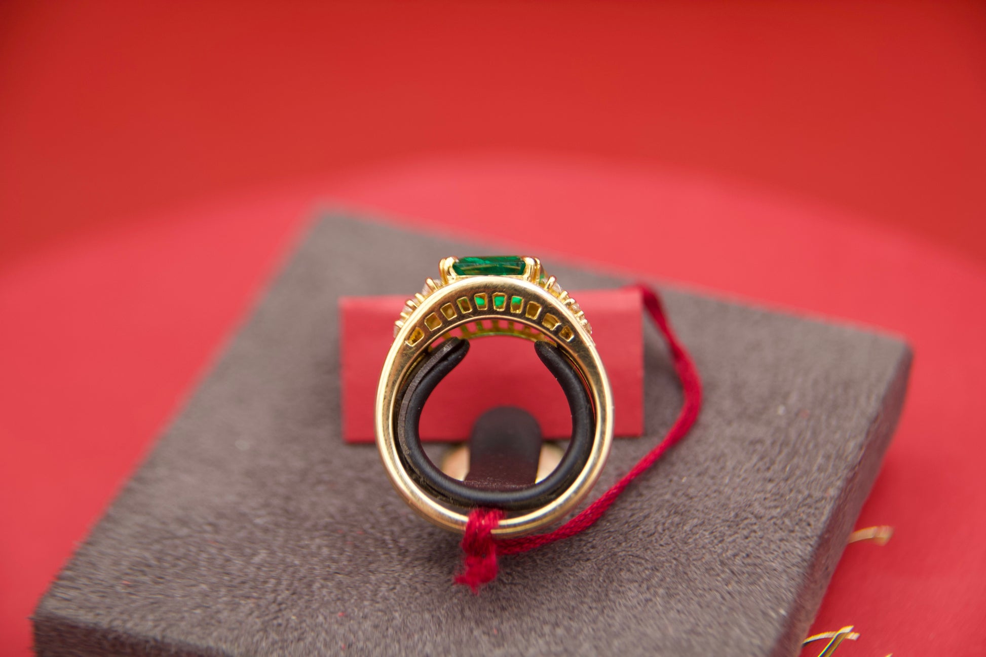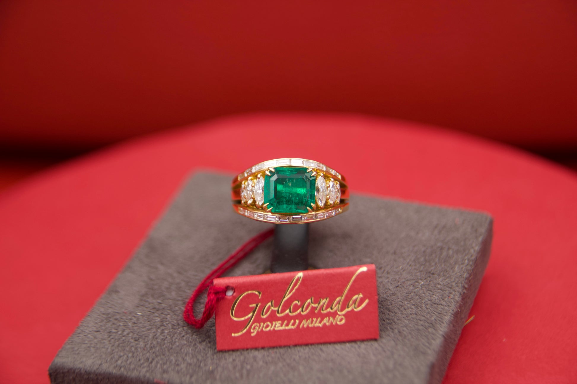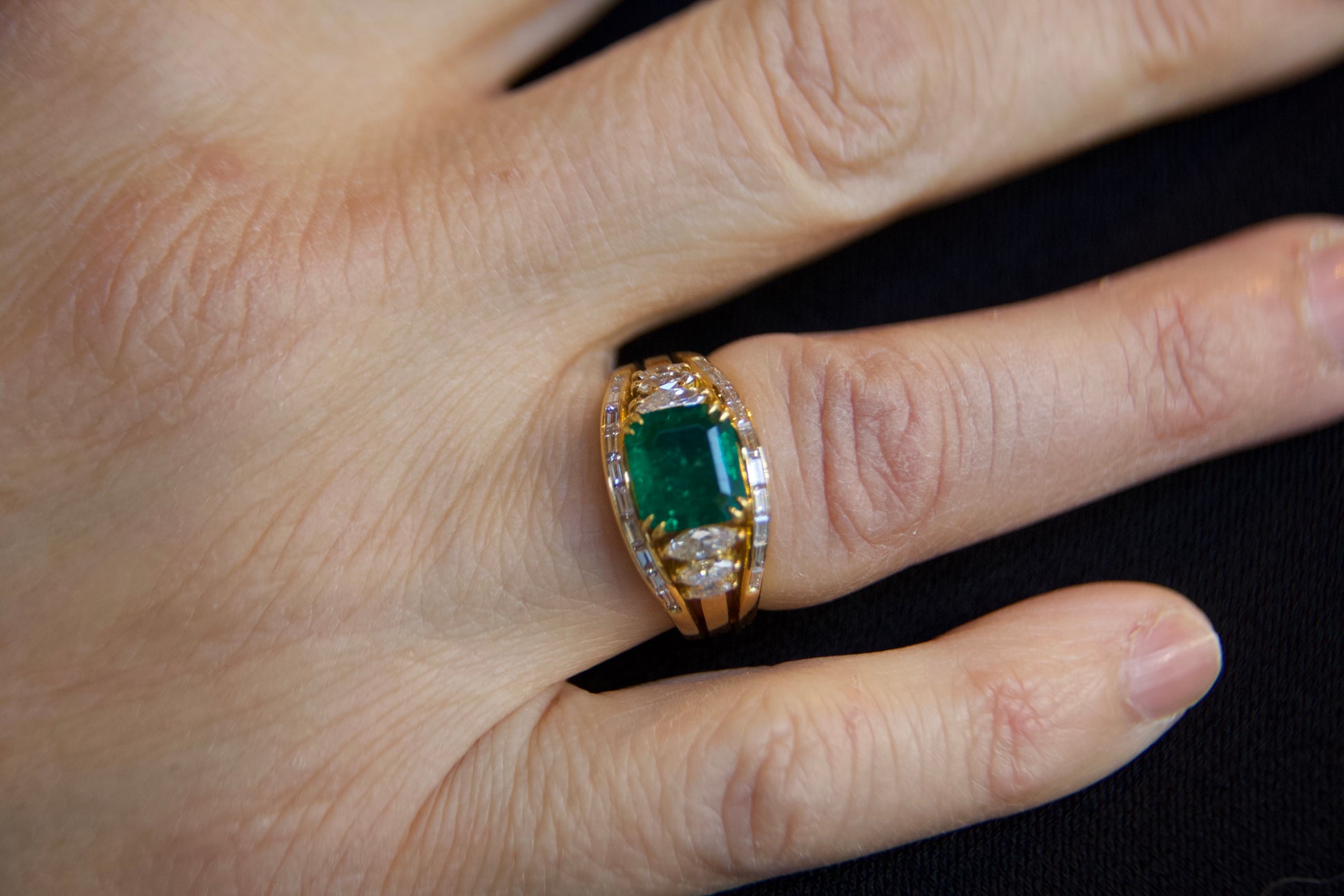 18k yellow gold ring, 9.10g, with a central 1.75ct Colombian emerald and 1.70ct marquise and baguette cut natural diamonds, FG colour, VS clarity. Size: ∅ 16 era: vintage 1960s