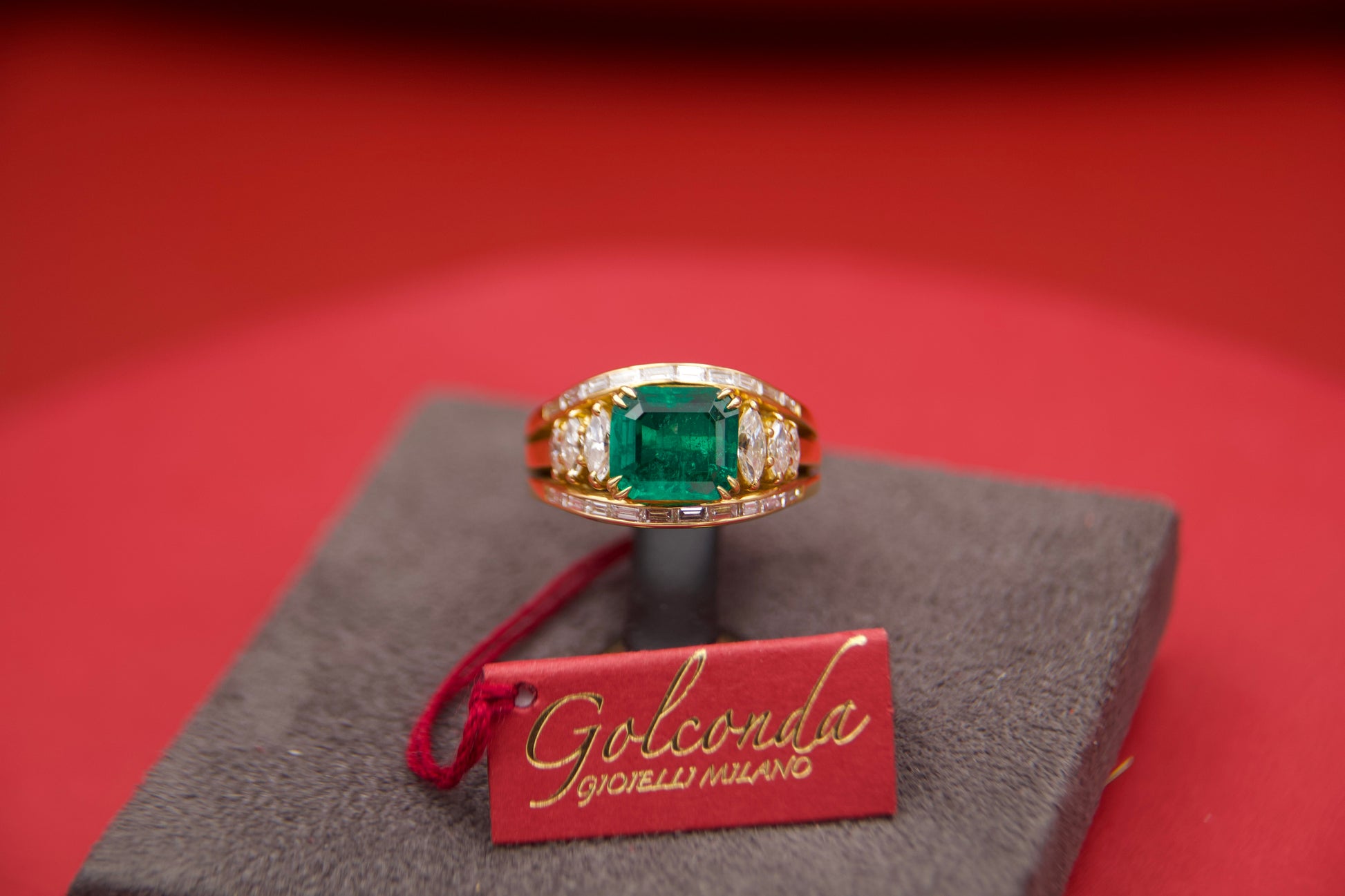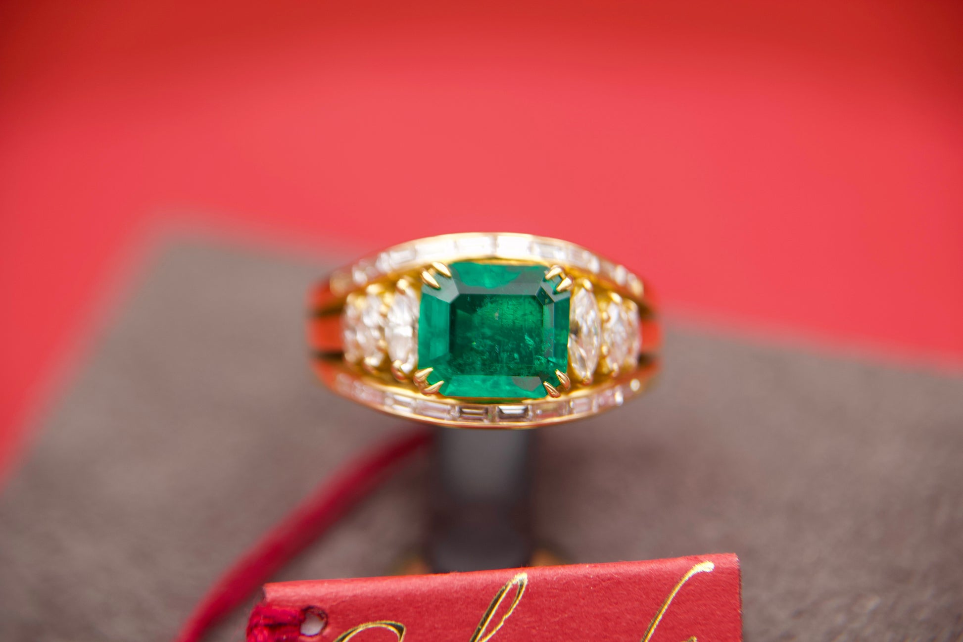 - Gems : natural navette and baguette cut diamonds for a total of 1.70 ct, FG color, VS clarity and a central natural Colombian emerald in a rectangular step cut of 1.75 ct.