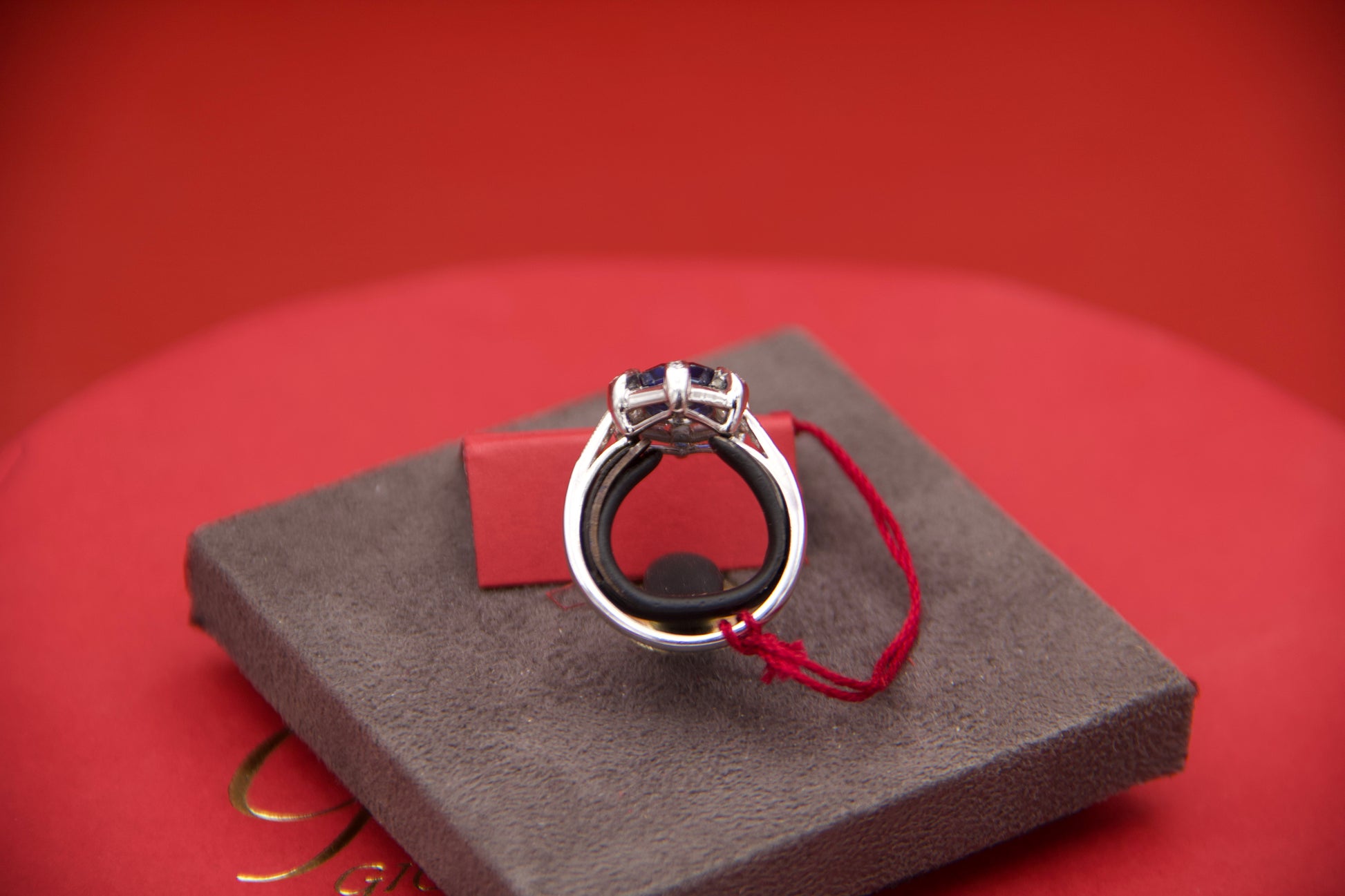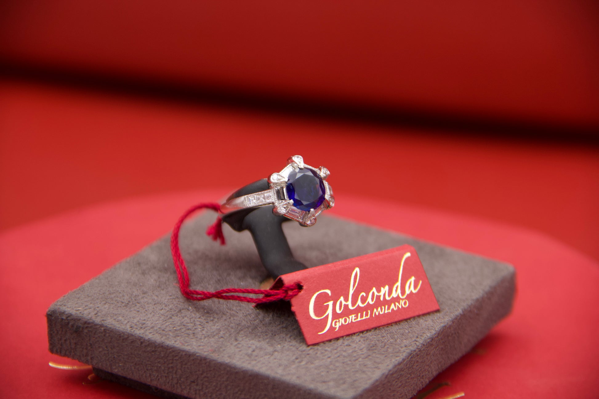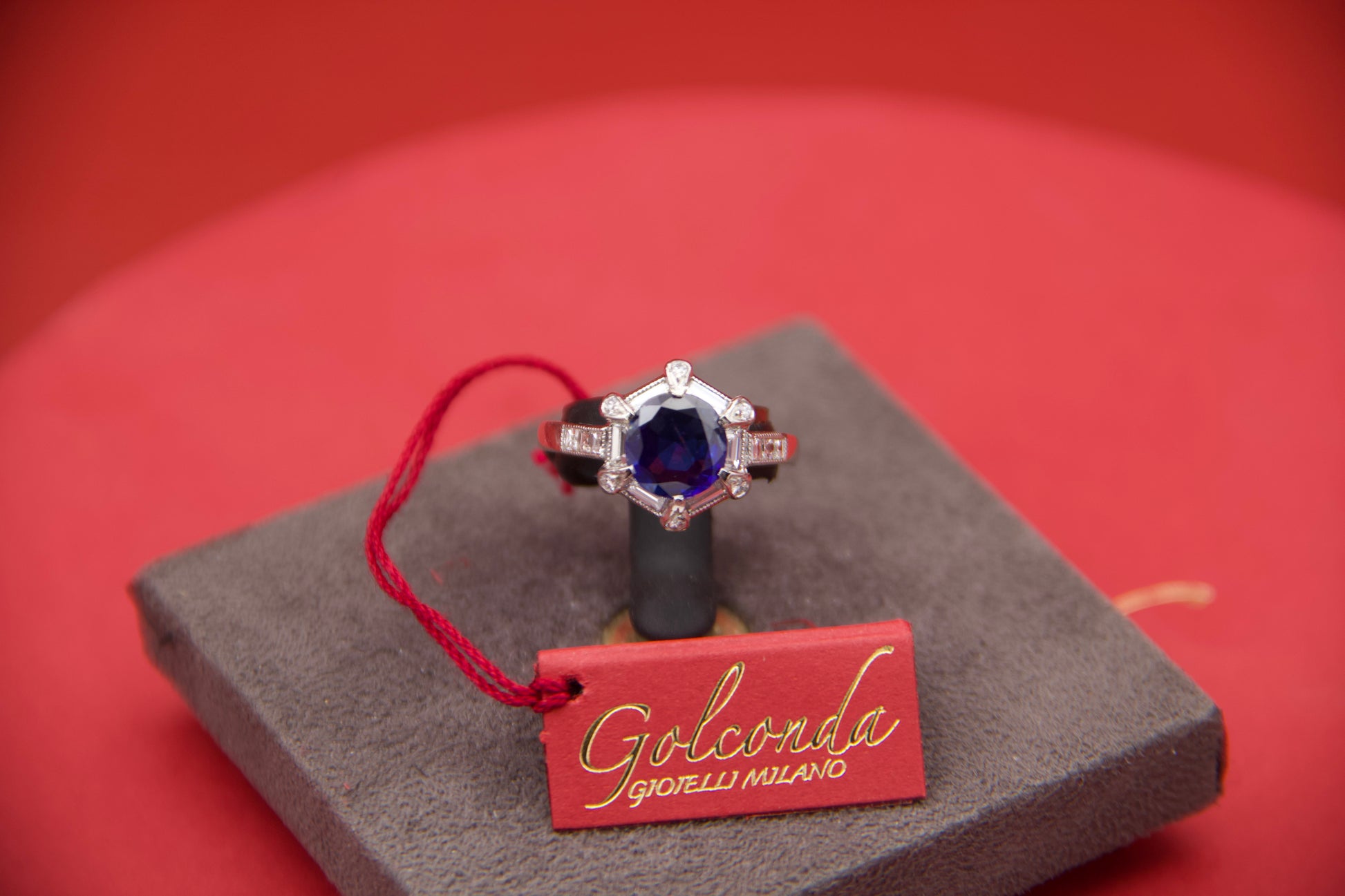 - Gems : natural brilliant-cut diamonds 0.05 ct, baguette-cut diamonds 0.42 ct, square-cut diamonds 0.18 ct, and a central natural NO HEAT sapphire 2.20 ct.