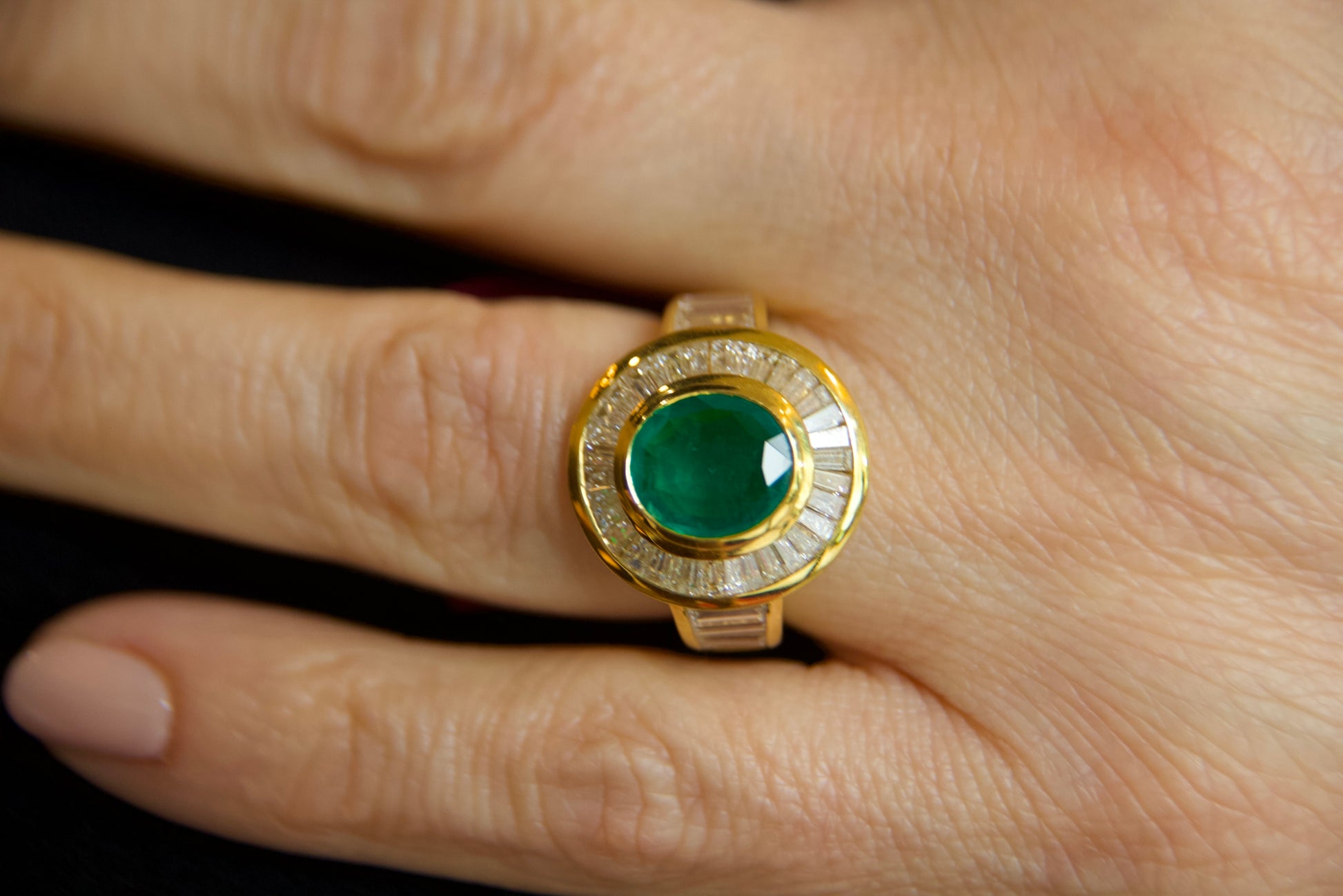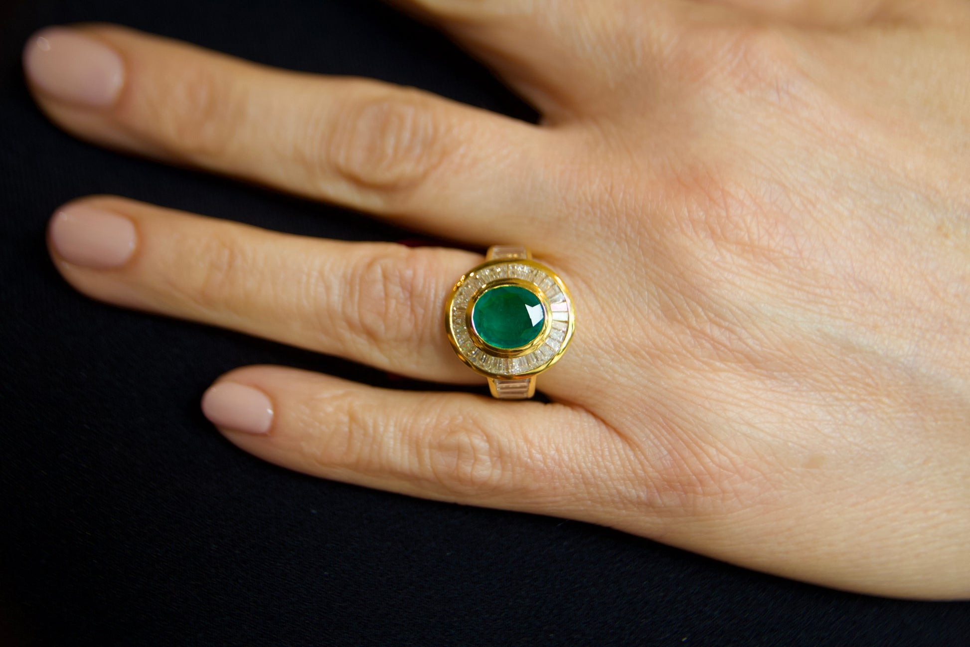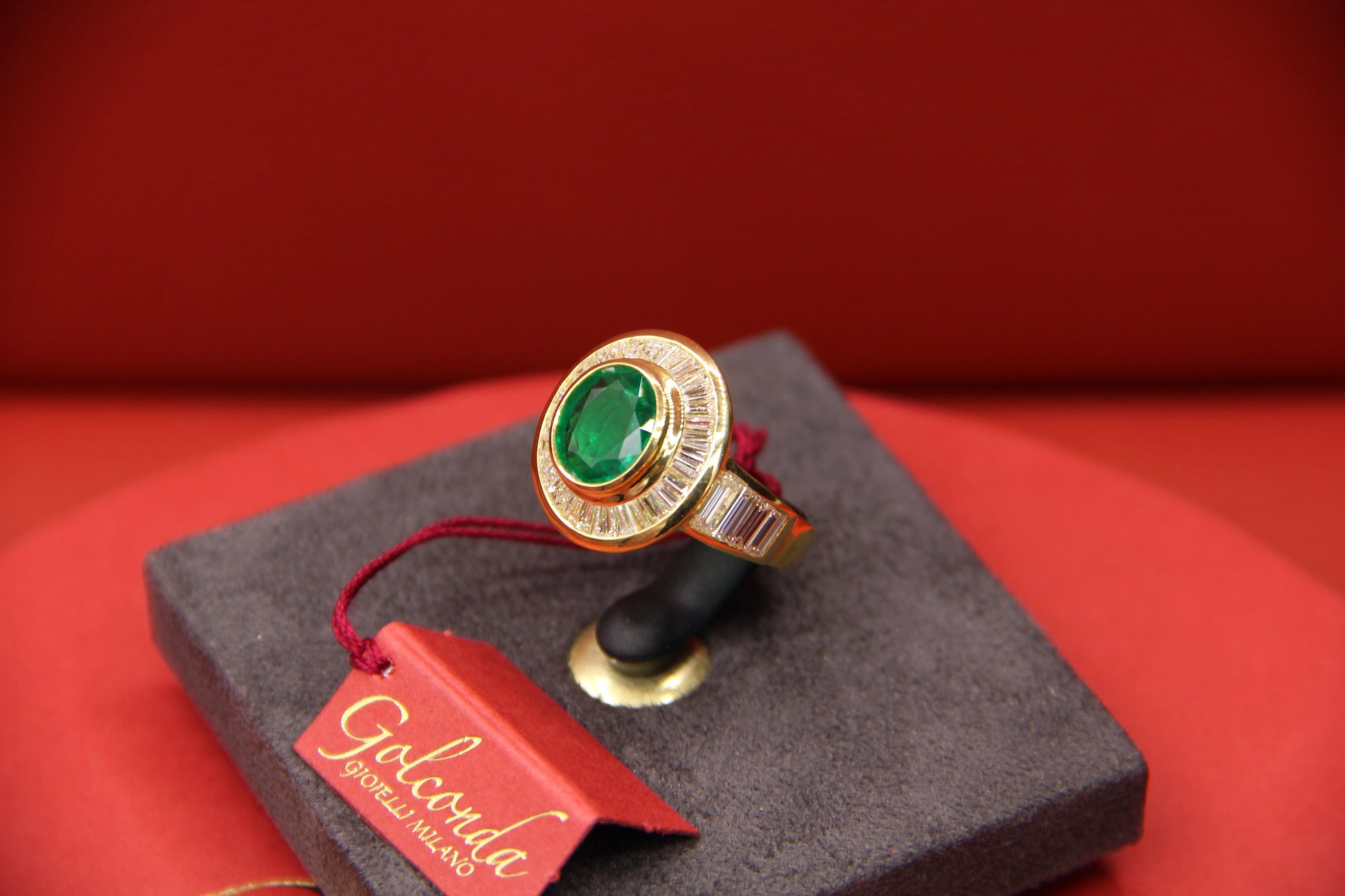 - Gems : 3.20 ct oval-cut natural emerald and 3.80 ct baguette- and tapered-cut natural diamonds, color: F, clarity: VS