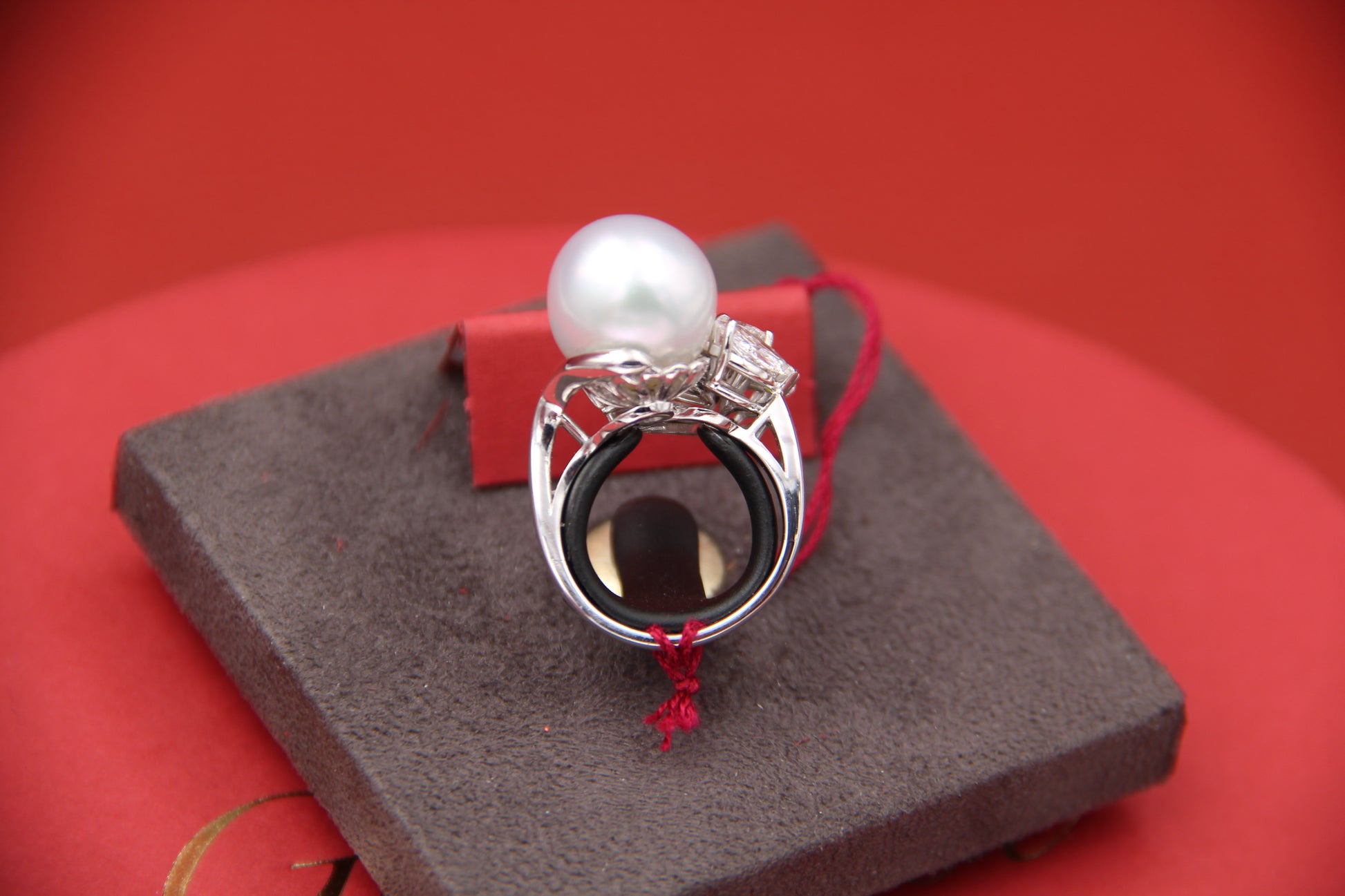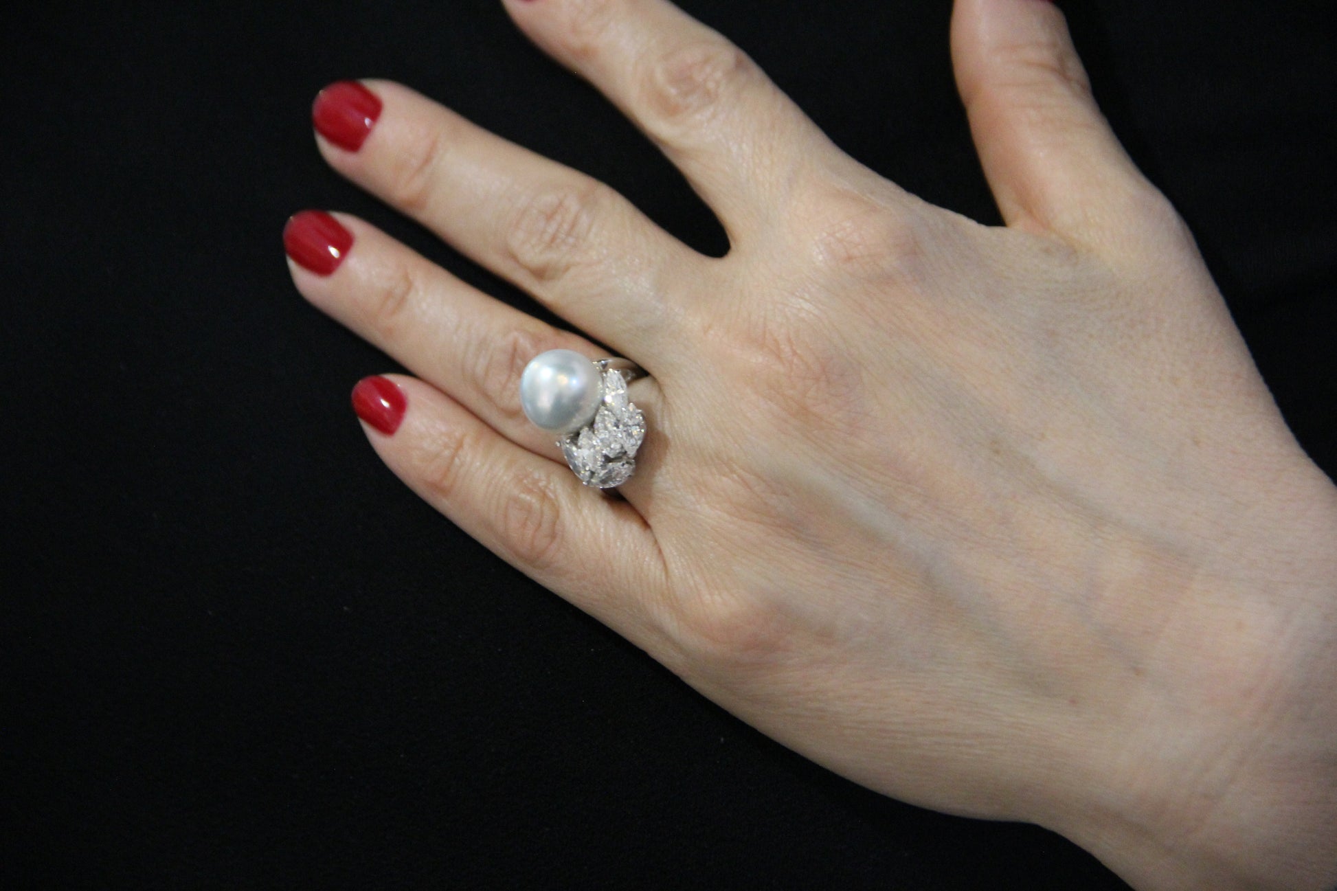 Platinum ring, 10.30g, with a central Australian South Sea (saltwater) pearl , ∅ 13mm, and natural marquise-cut diamonds, 2.40ct, F color, SI clarity. Size: ∅ 10 Era: vintage 1960s