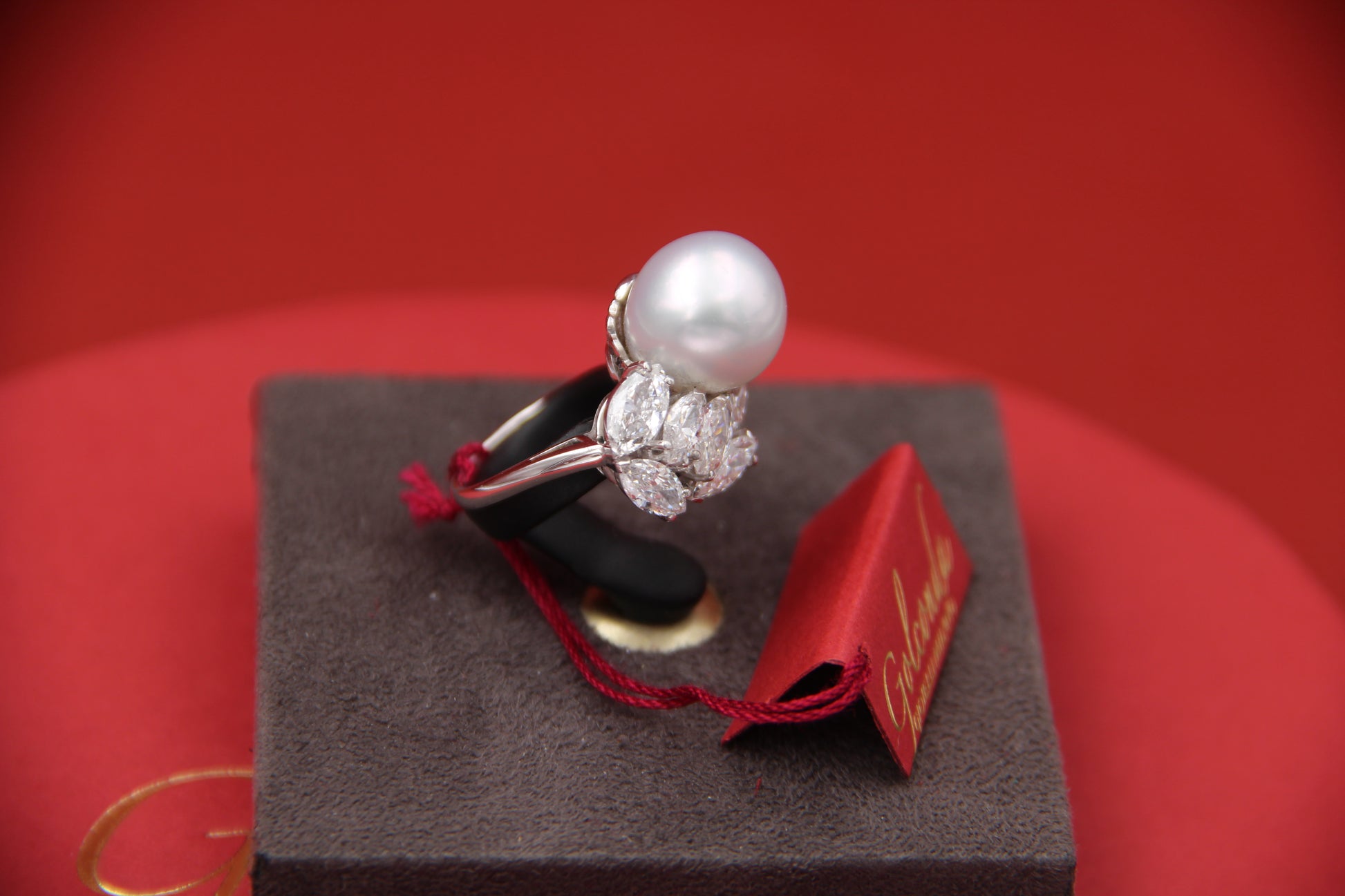 - Gems : natural navette cut diamonds for a total of 2.40 ct, F color, SI clarity and a central Australian South Sea pearl ∅ 13 mm