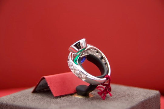 - Gems : natural oval-cut sapphire 2.50 ct and natural oval-cut emerald 1.80 ct, natural brilliant-cut diamonds 2.30 ct, color: G, clarity: VS