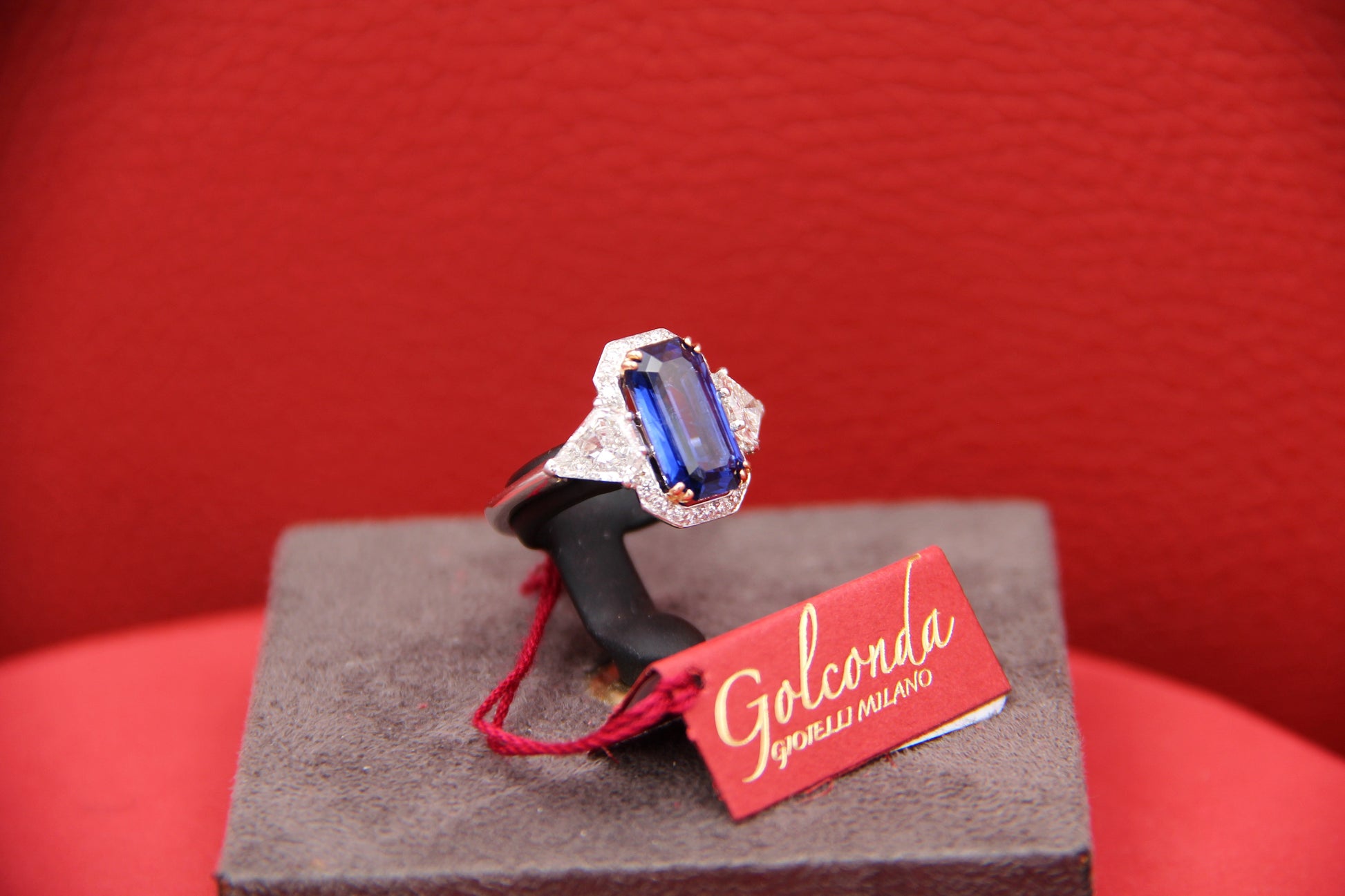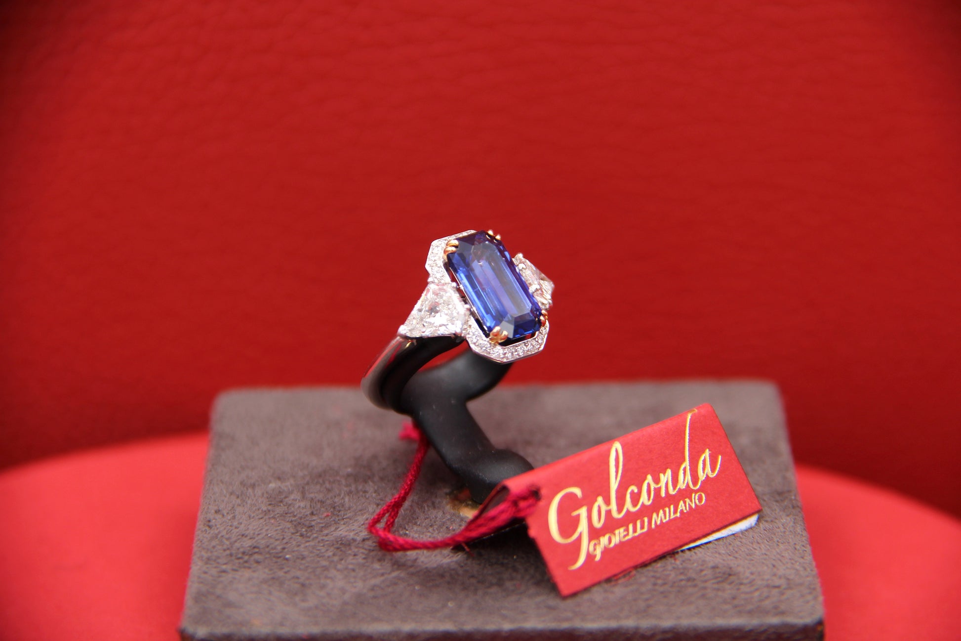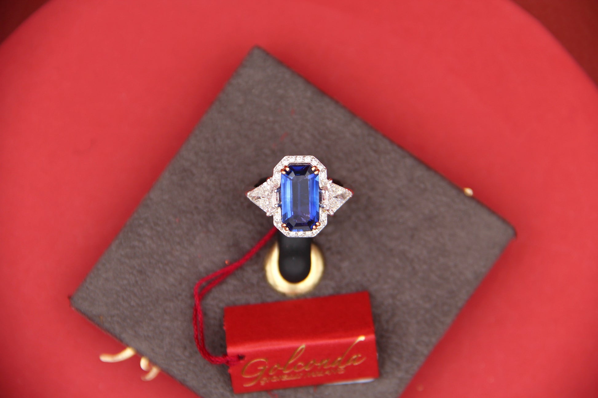 - Gems : natural rectangular cut sapphire 3.41 ct and natural brilliant and triangle cut diamonds 1.35 ct, color: F, clarity: VS