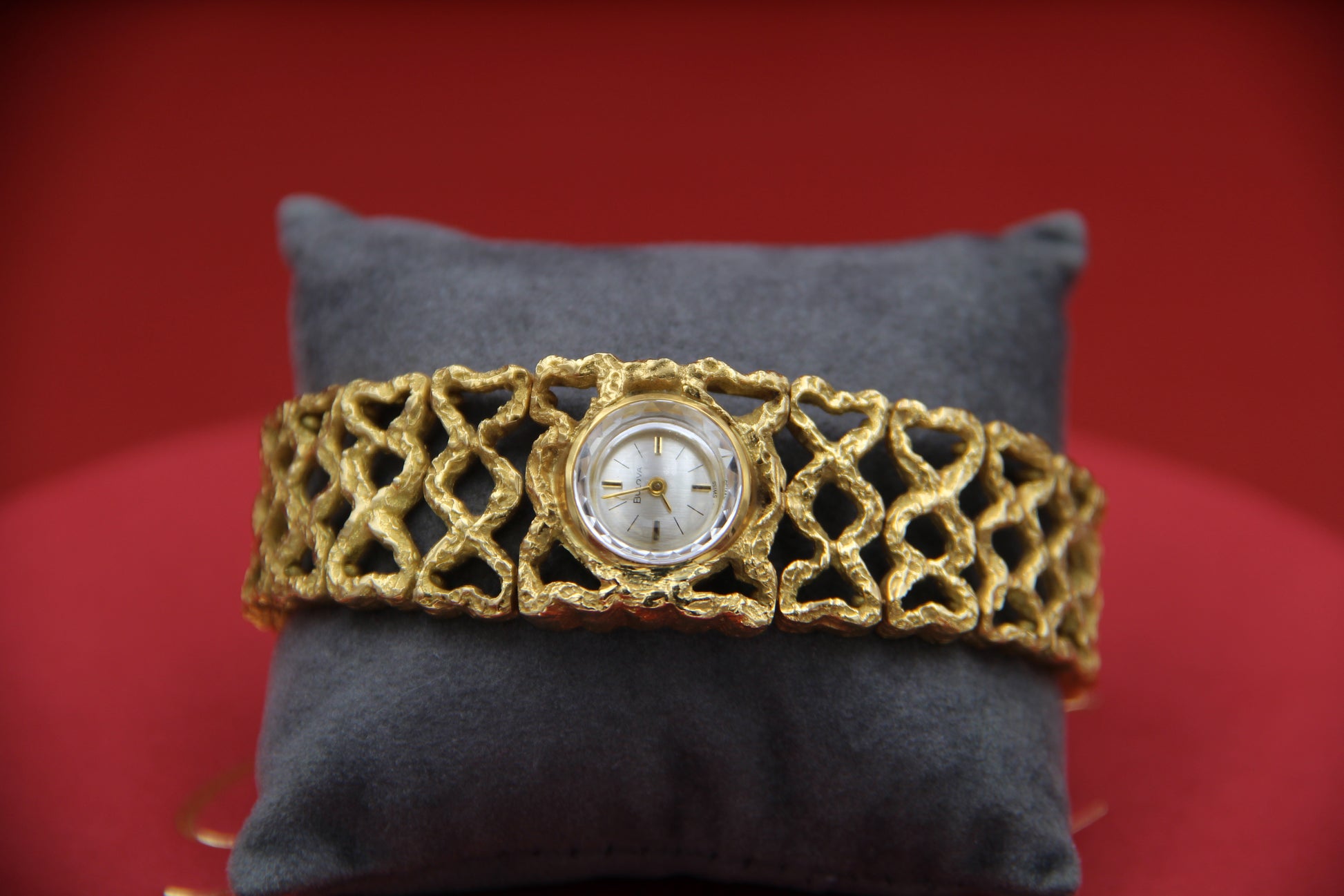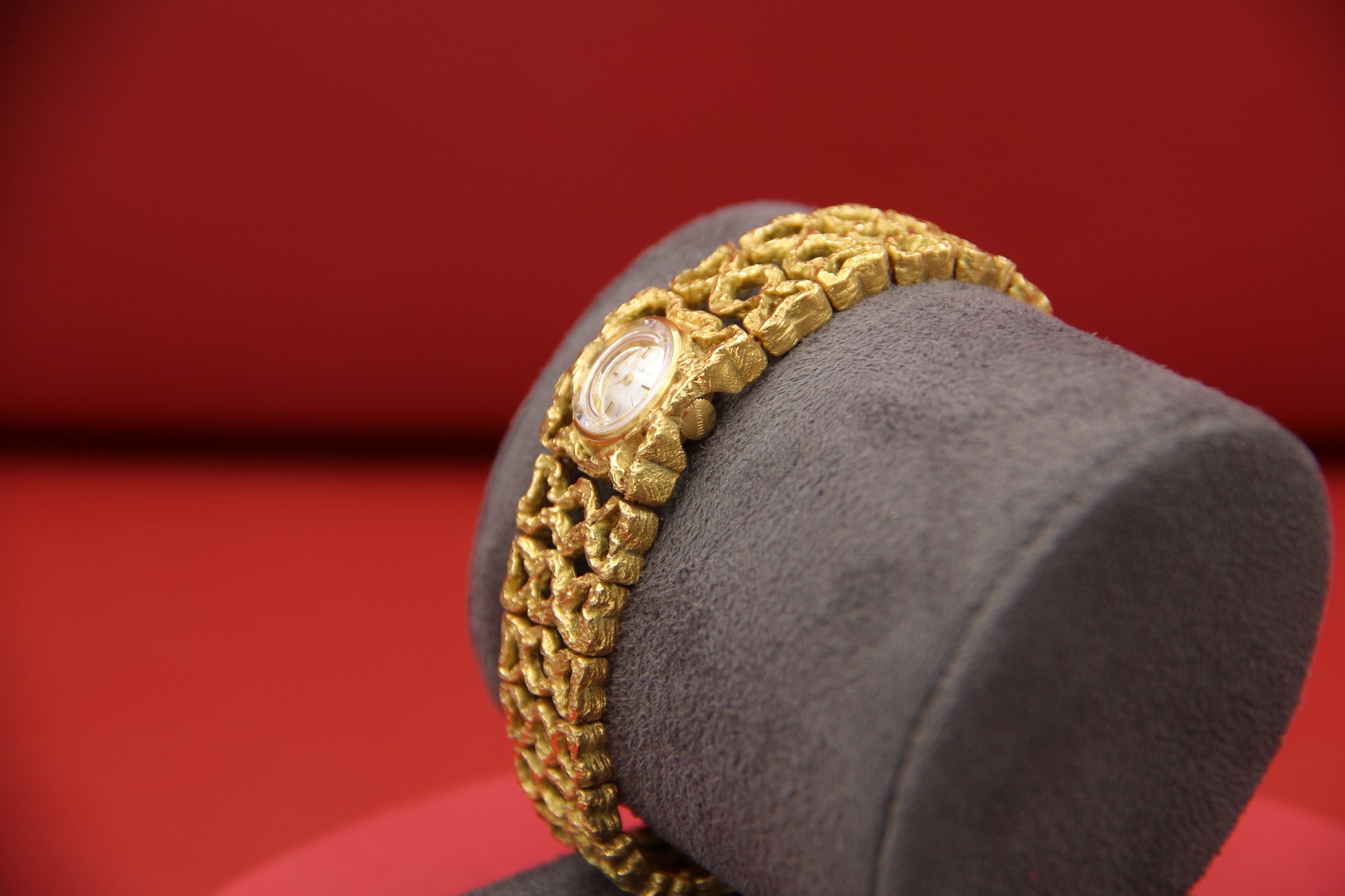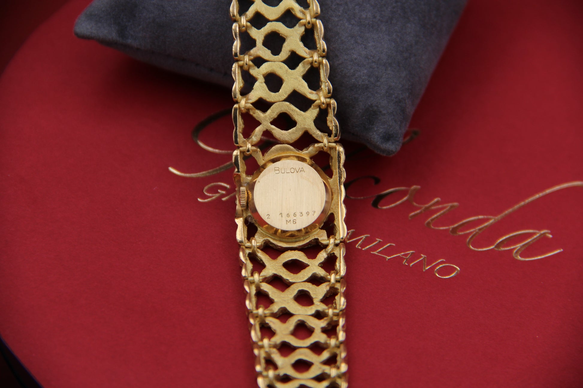 Bulova 18k yellow gold watch, 59g, manual winding, white dial. Dimensions: 16.5 x 2 cm. Period: 1950s-60s.
