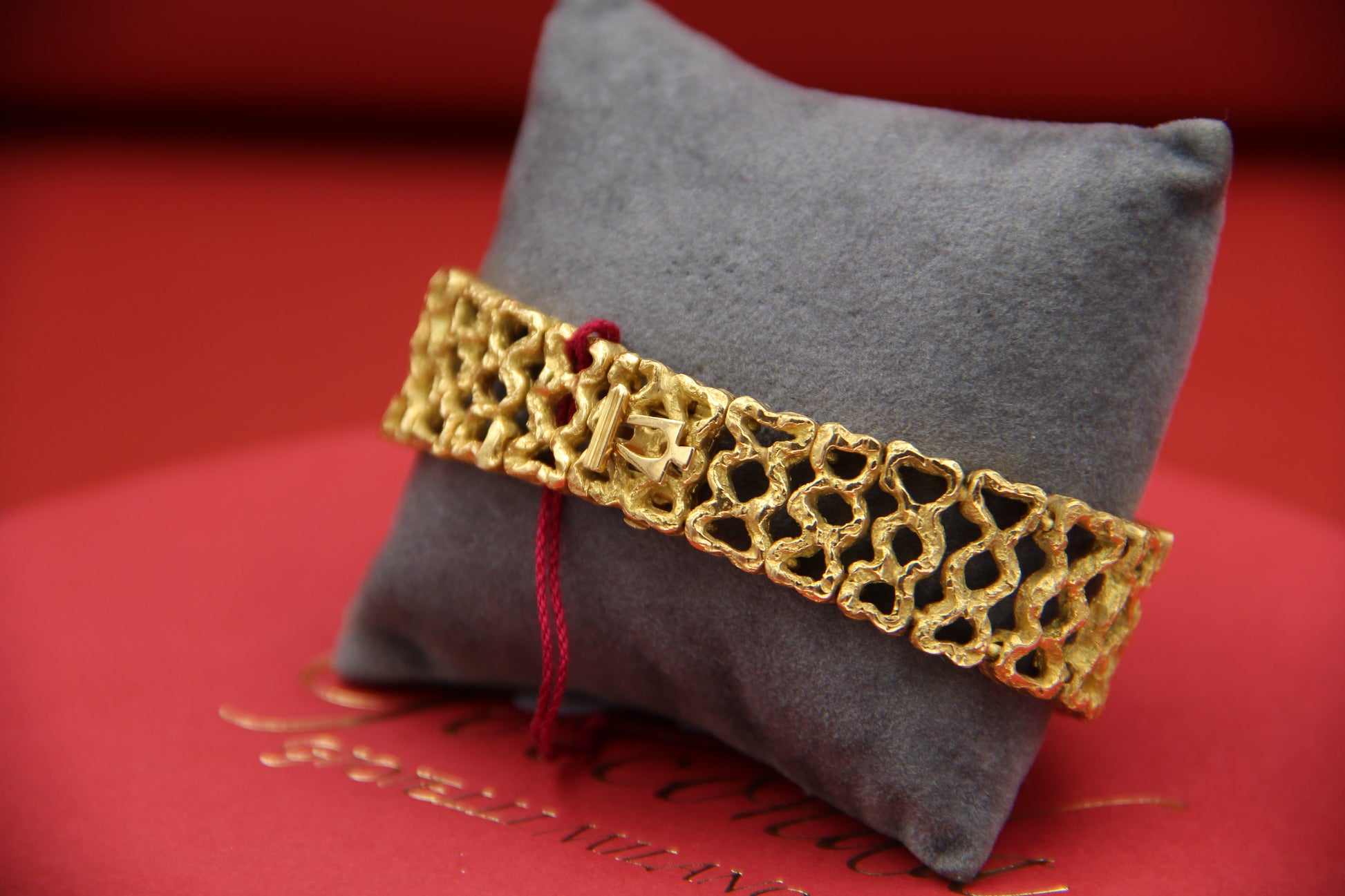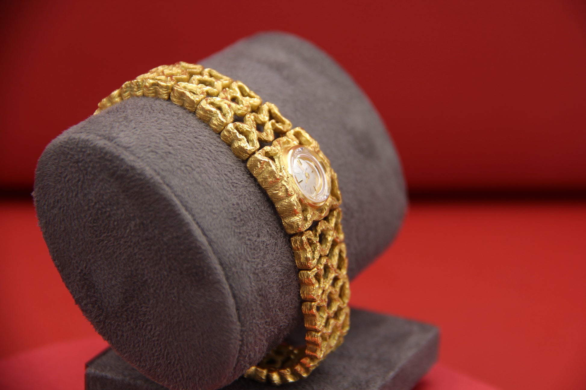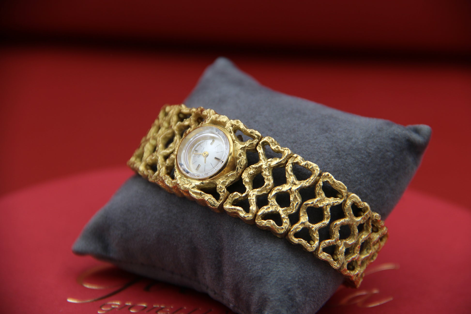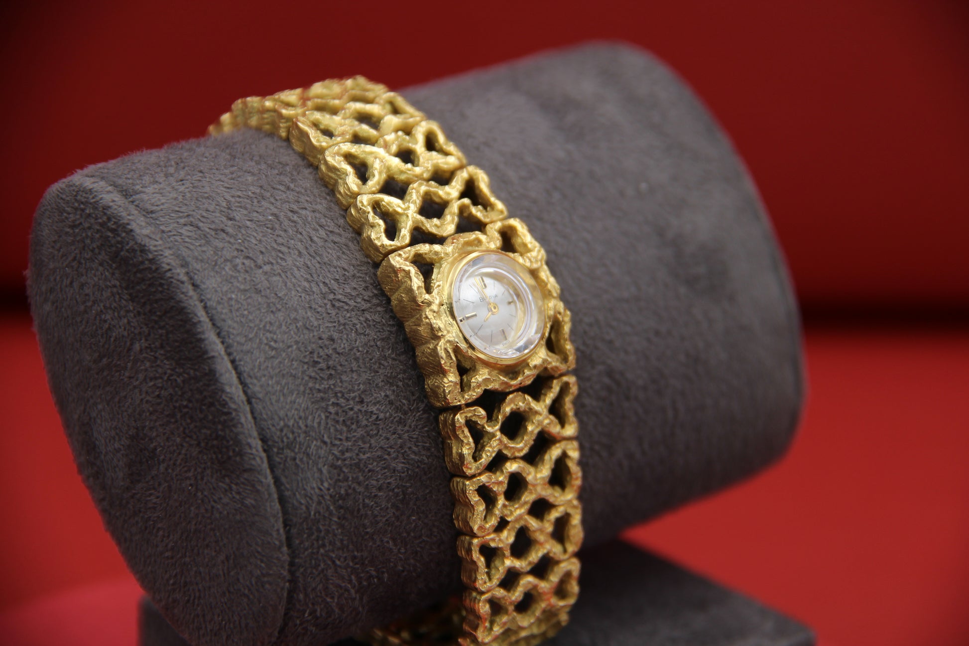 Bulova 18k yellow gold watch, 59g, manual winding, white dial. Dimensions: 16.5 x 2 cm. Period: 1950s-60s.