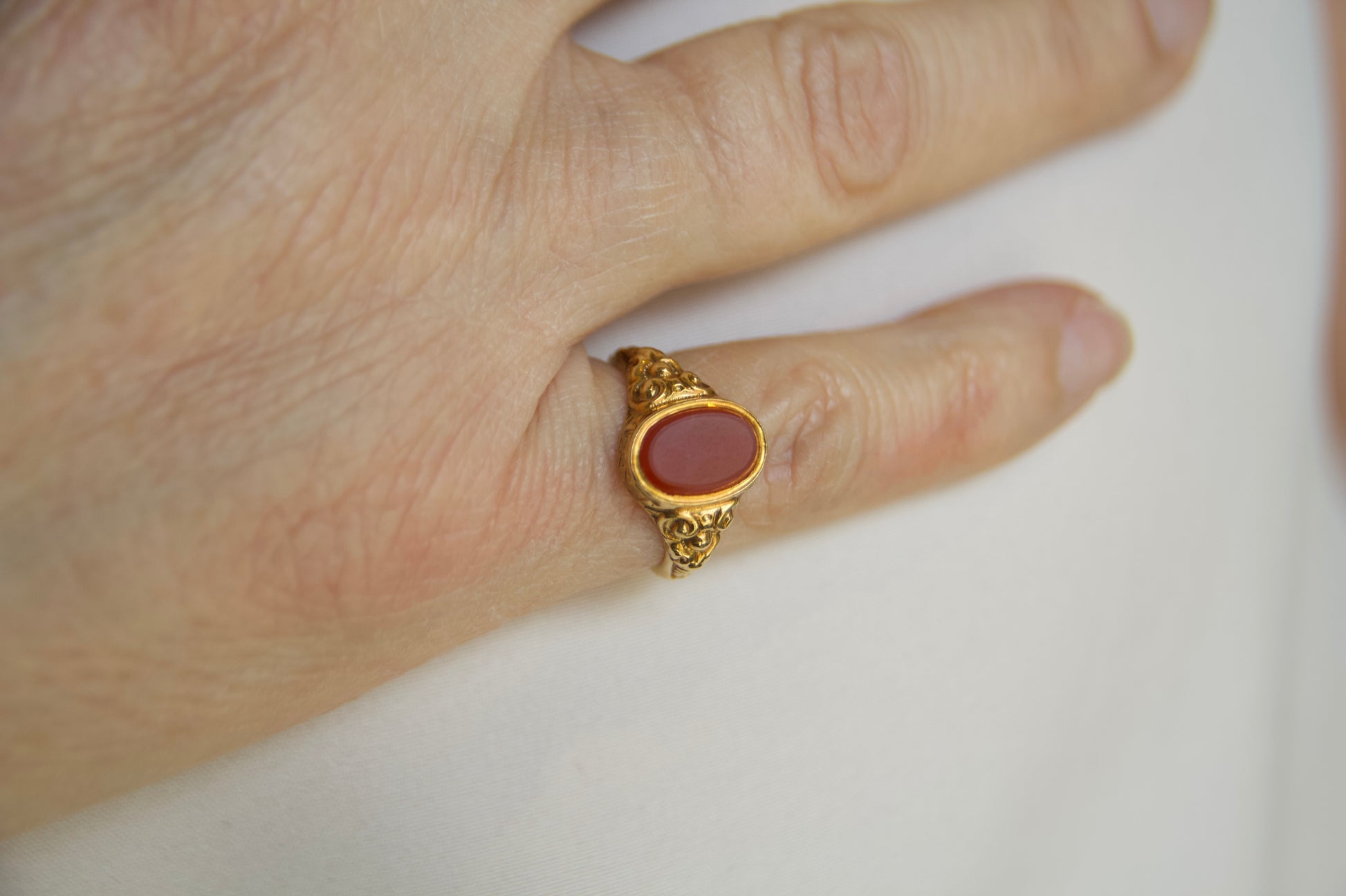 Splendido esempio di oreficeria dei primi del '900, questo anello in oro 18kt e corniola celebra l'estetica Belle Époque con una struttura solida e riccamente lavorata. I particolari motivi a sbalzo che decorano il gambo rivelano una sapiente maestria artigianale, unendo linee organiche a dettagli geometrici di grande forza visiva. La corniola ovale completa l’opera con la sua tipica traslucentezza, rendendo questo gioiello un pezzo d'epoca di grande portabilità e fascino storico.