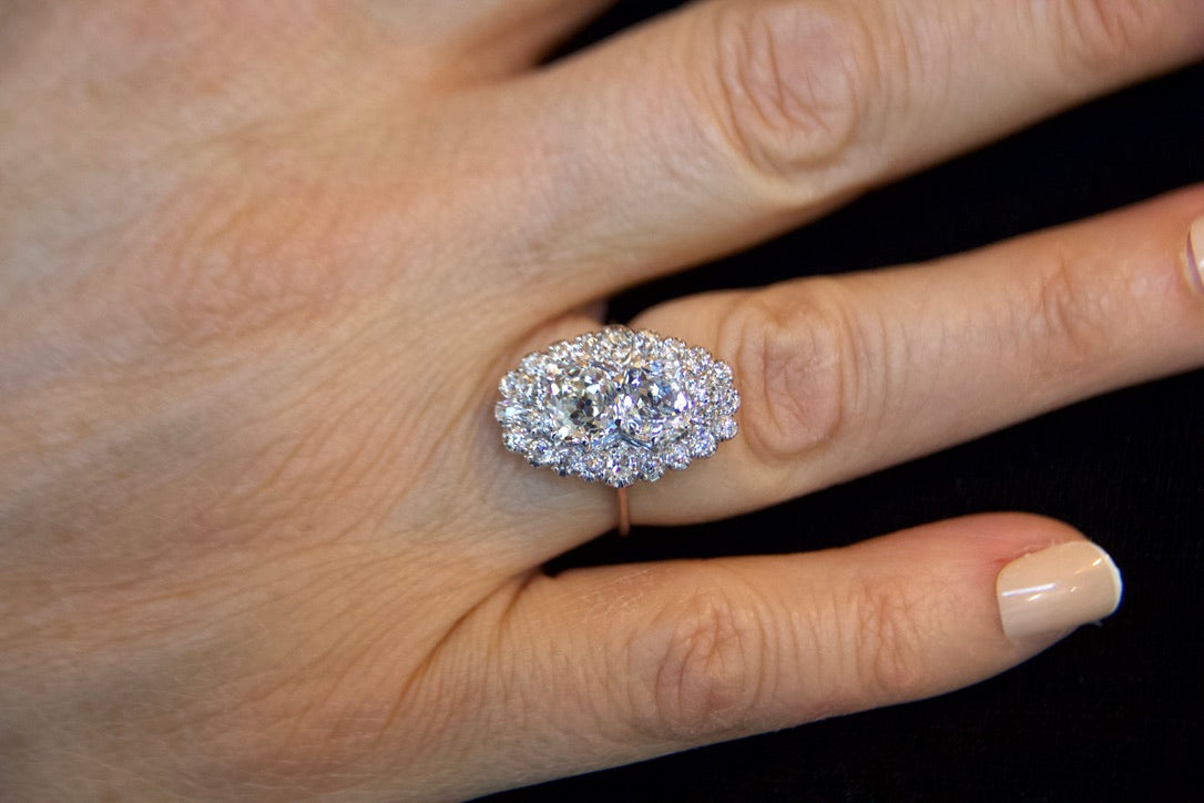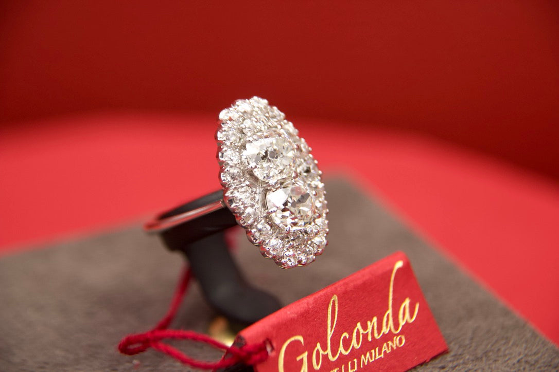 Il design a grappolo (cluster) è studiato per massimizzare la luce, ma il vero fascino risiede nei suoi protagonisti: i due diamanti taglio antico centrali. Questo taglio storico regala una luminosità calda e profonda, ben diversa dalle gemme moderne.