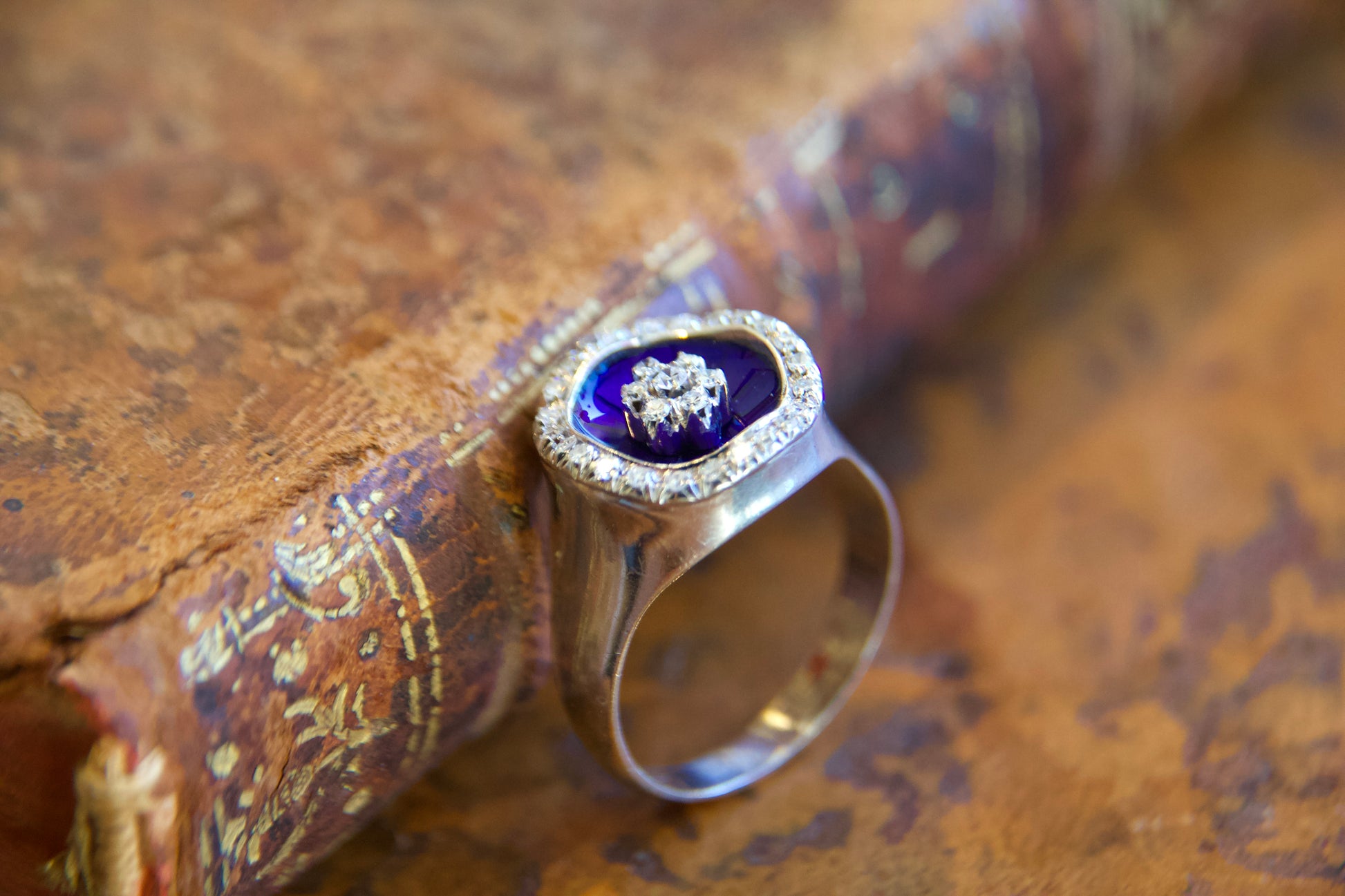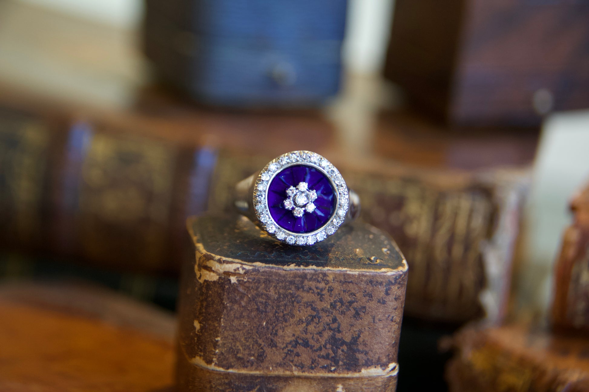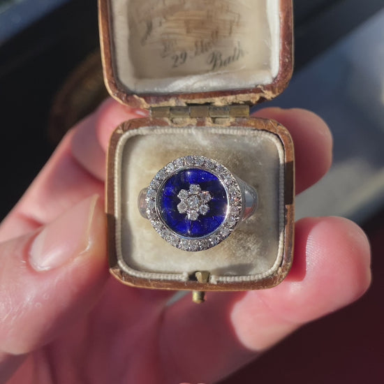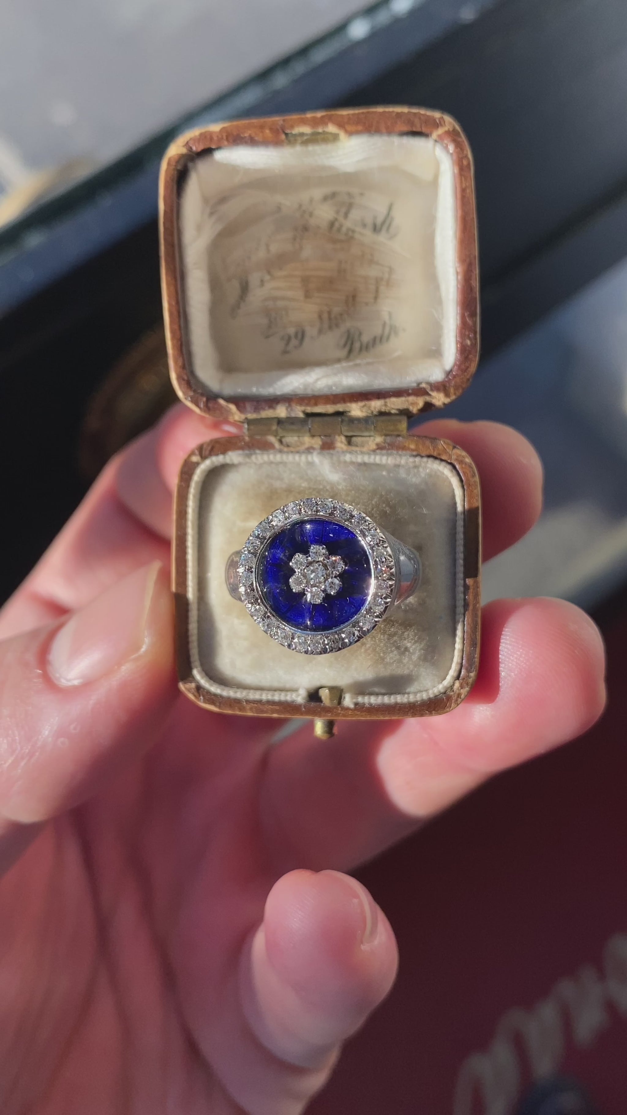Entrate nel glamour degli anni '50 con questo anello che è un vero capolavoro di contrasti. Al centro, un pavé di diamanti naturali taglio Huit-Huit lo smalto blu scuro fa risaltare i diamanti come stelle nel cielo, lavorata con una tecnica a raggiera che crea un incredibile senso di profondità.