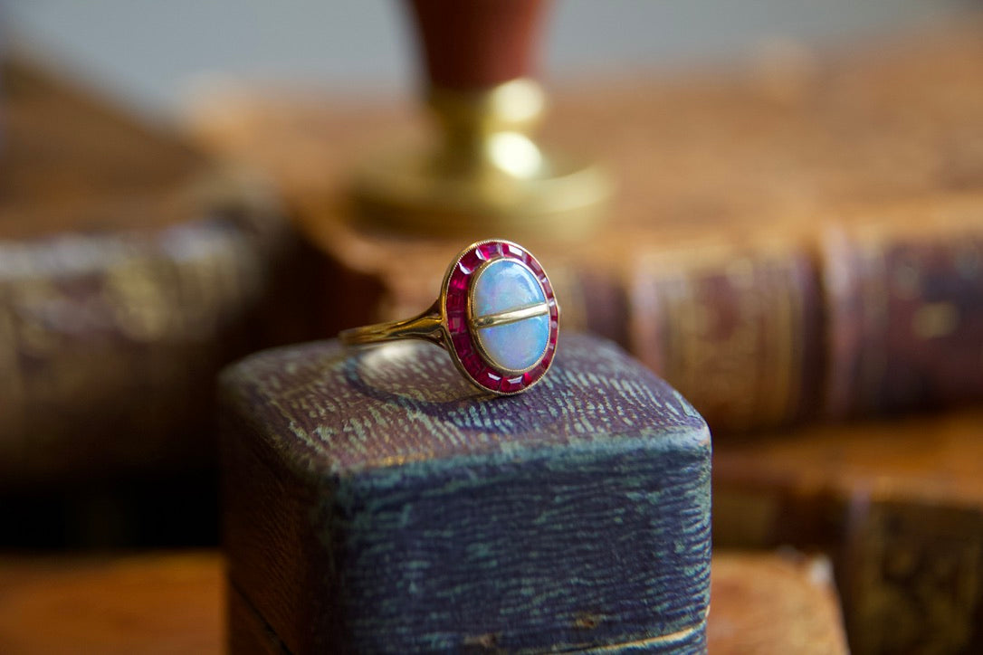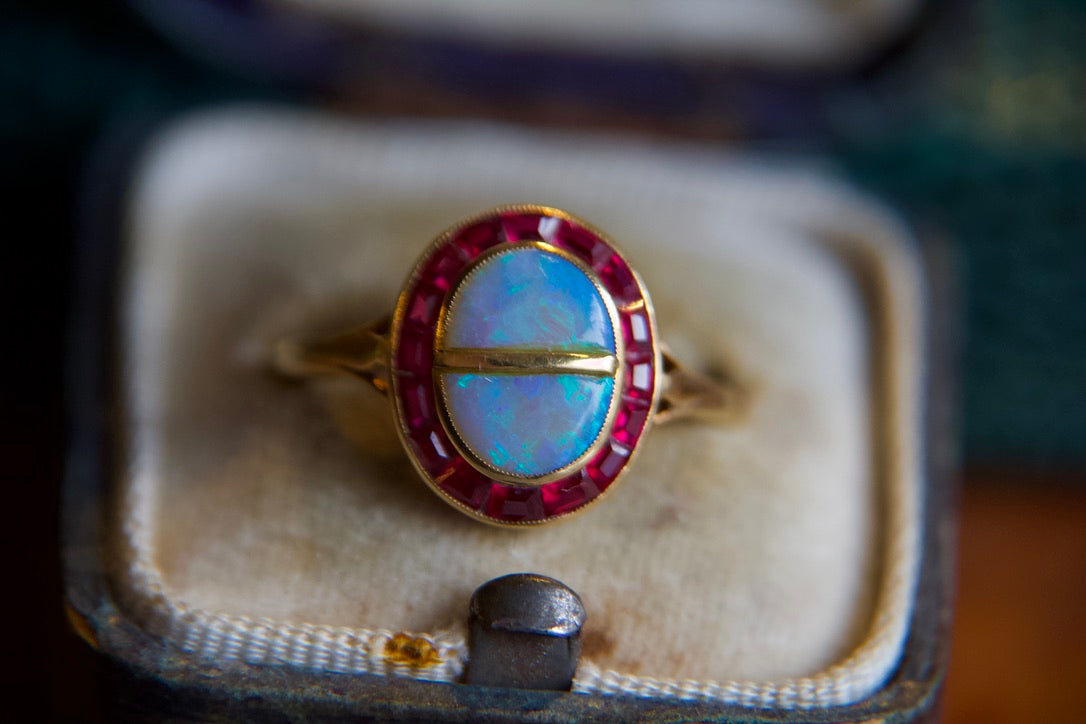 - Gemma: Un opale taglio ovale probabilmente Australiano impreziosito da un inserzione in oro e contorno di rubini calibrati "Verneuil"