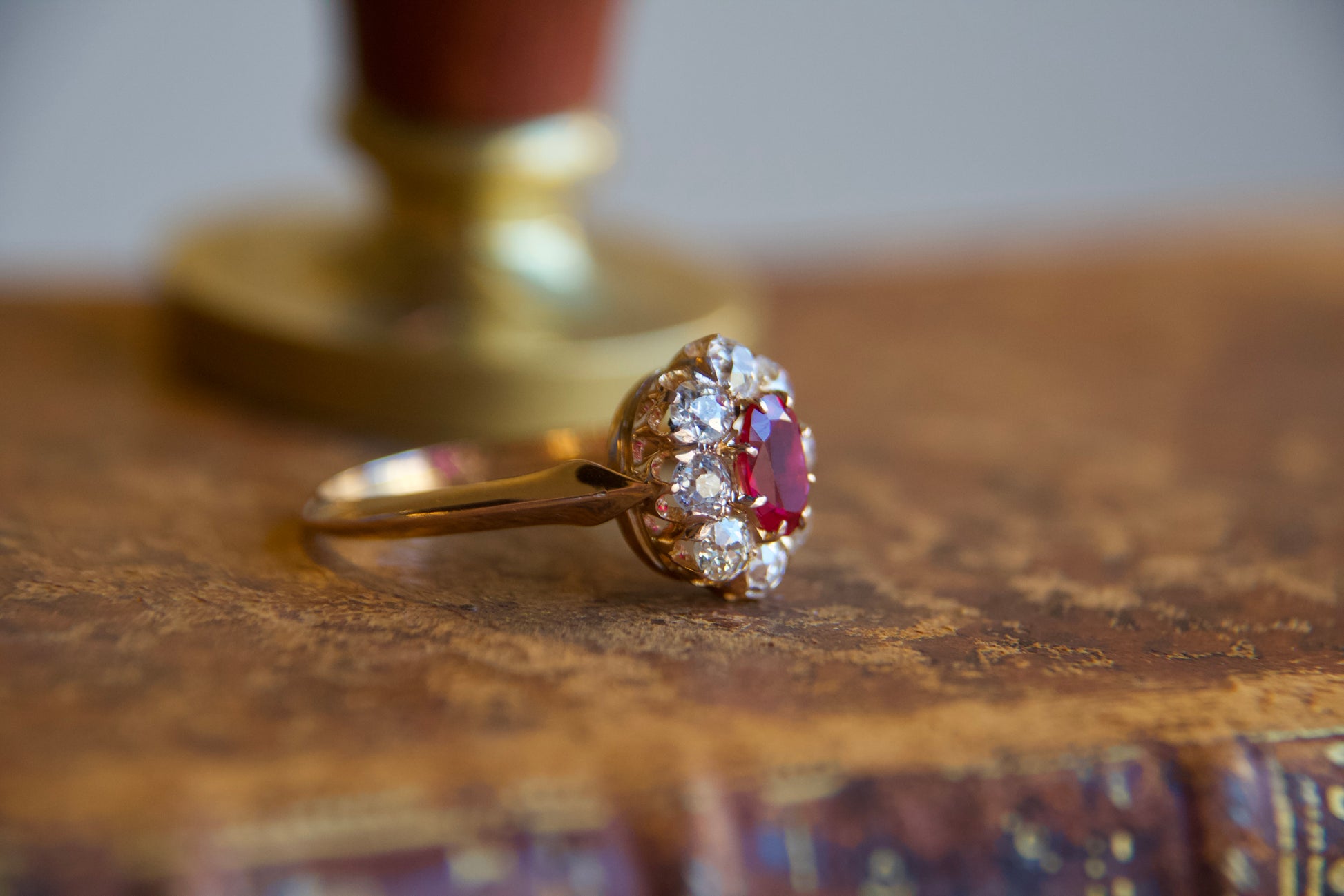 Questo anello è una perfetta rappresentazione dell'eleganza di quell'epoca: la struttura in oro rosa (caratteristica dei gioielli più romantici del tempo) esalta la tinta vivida del rubino centrale. I diamanti che lo circondano, con il loro taglio antico, raccontano di mani esperte che hanno sfaccettato ogni pietra per renderla unica, mai uguale alla precedente. Indossarlo è come sussurrare un segreto che viene dal passato.