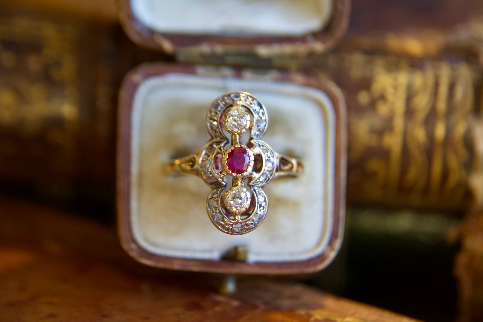 Al centro della composizione brilla un rubino ovale dal colore intenso, incorniciato verticalmente da due diamanti taglio antico che regalano riflessi caldi e profondi, impossibili da trovare nei tagli moderni. La struttura è ulteriormente impreziosita da una delicata lavorazione a grani e da un contorno di diamanti taglio rosetta, che conferiscono al gioiello una lucentezza d'altri tempi.