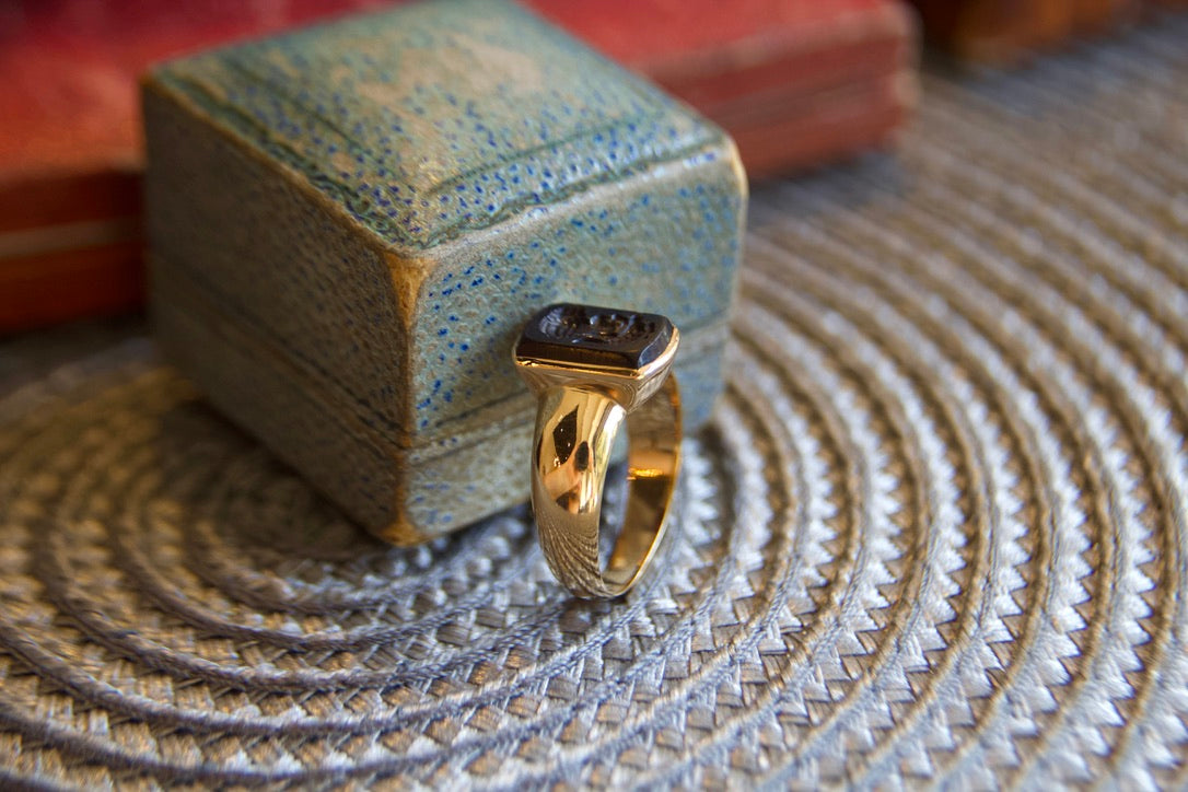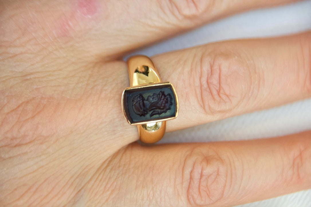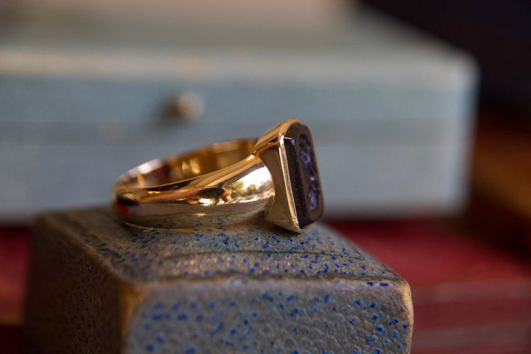 Realizzato in Oro Giallo 18kt con una notevole presenza (8,33 gr), la sua composizione è pensata per durare. Al centro, la pasta vitrea incisa a mano raffigura un guerriero, portando con sé il fascino e il simbolismo dei gioielli antichi (camei e sigilli).