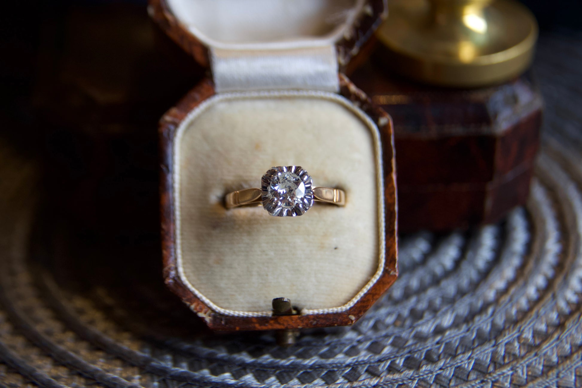 Questo splendido anello solitario risale alla prima metà del XX secolo ed è realizzato in Oro Rosa e Bianco 18kt (3,10 gr). Il protagonista è il diamante centrale, un autentico Taglio Old European da 0,50 ct (colore G-H, purezza SI), Questo taglio d'epoca è amato per la sua luce diversa dalla brillantezza moderna.