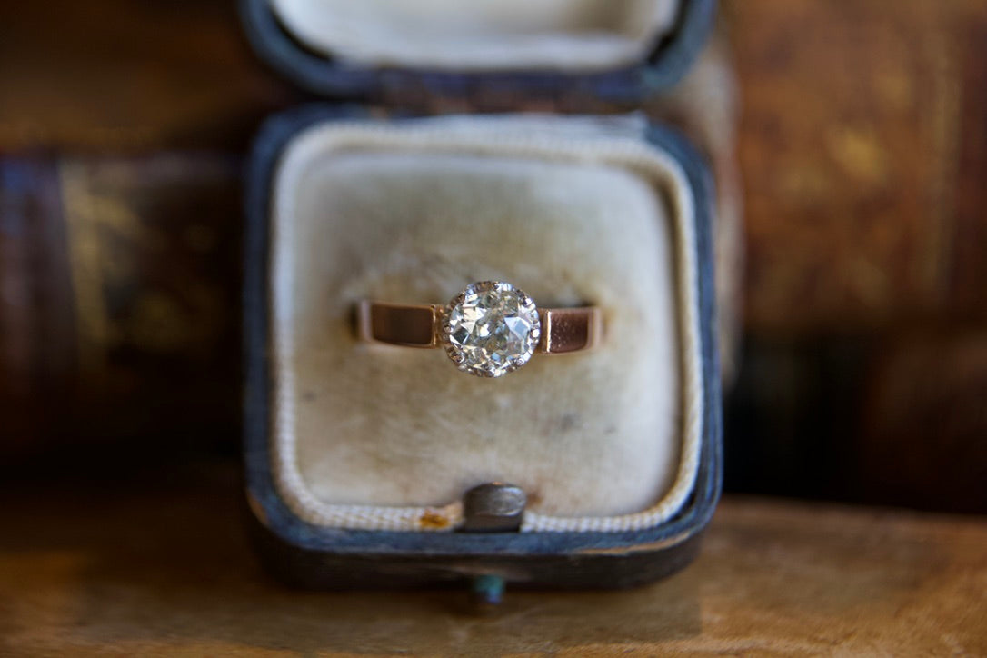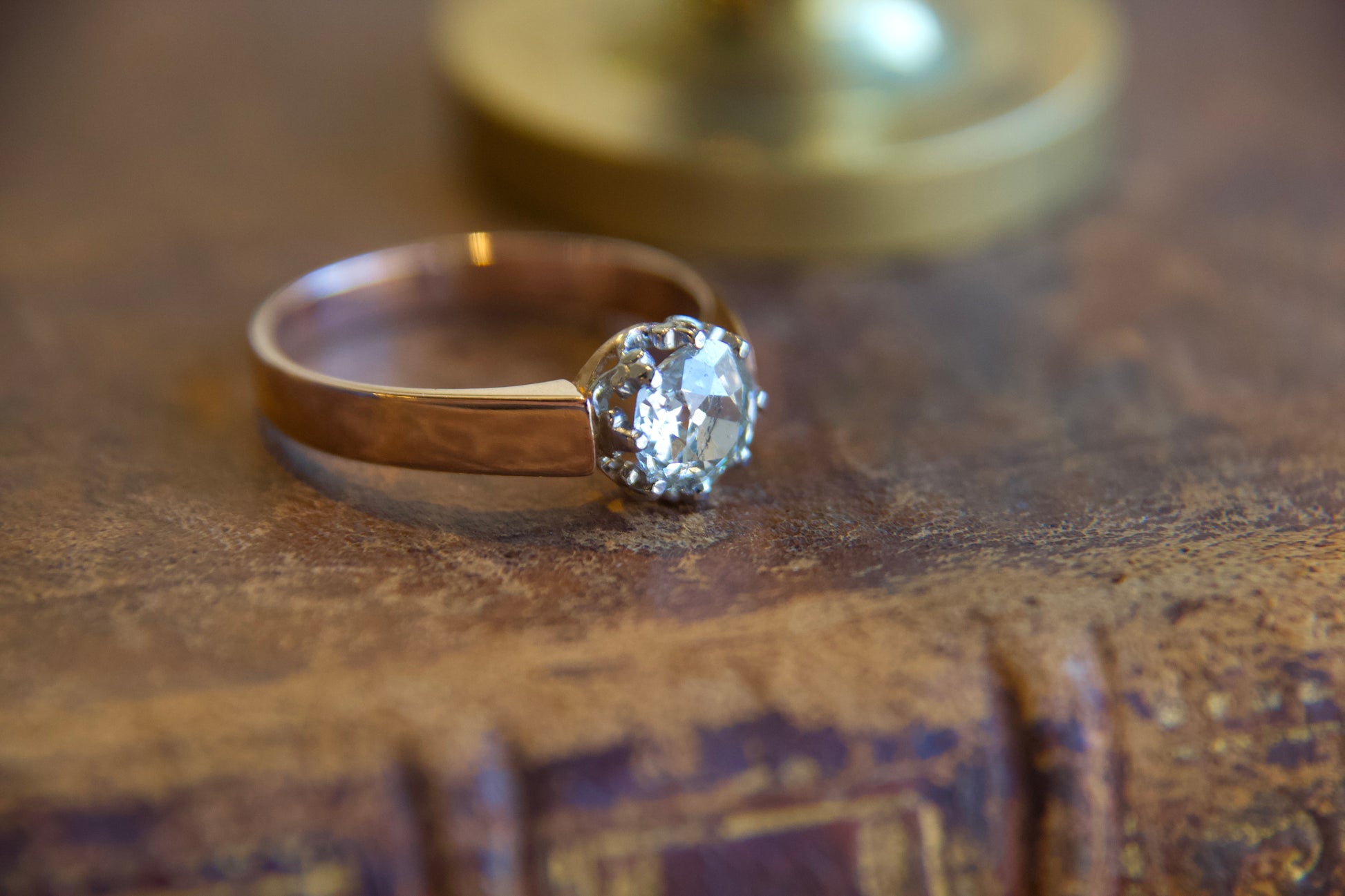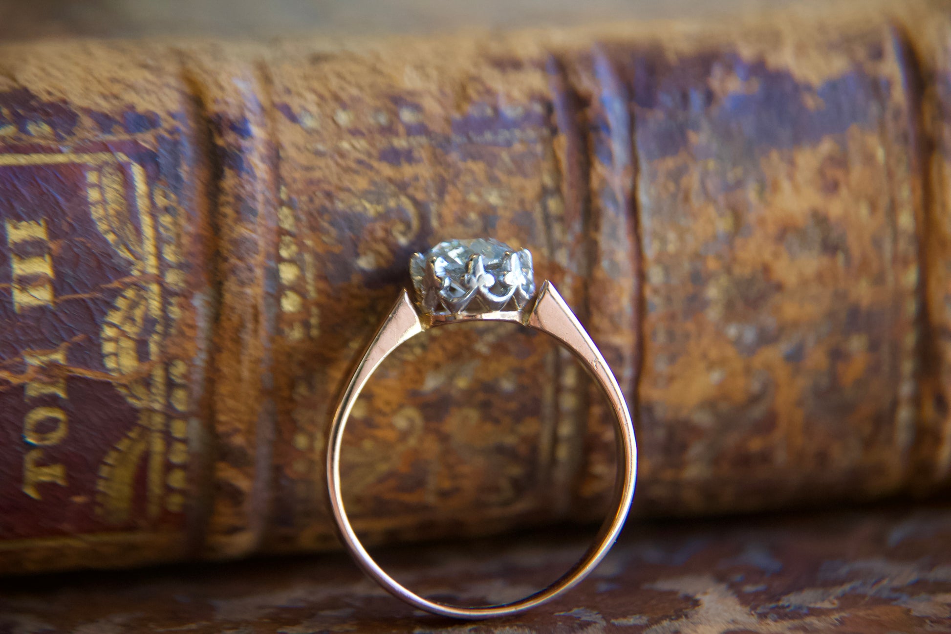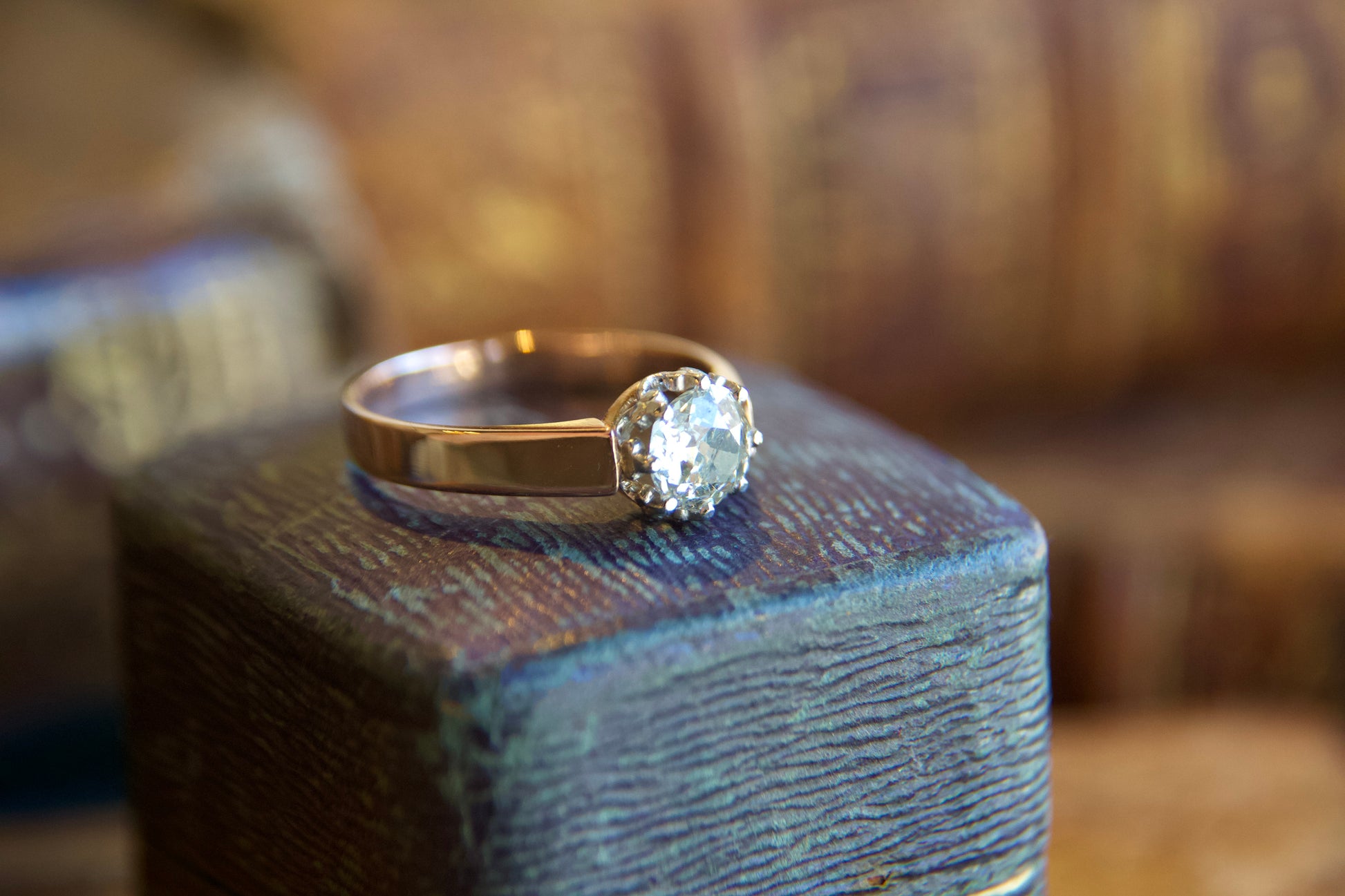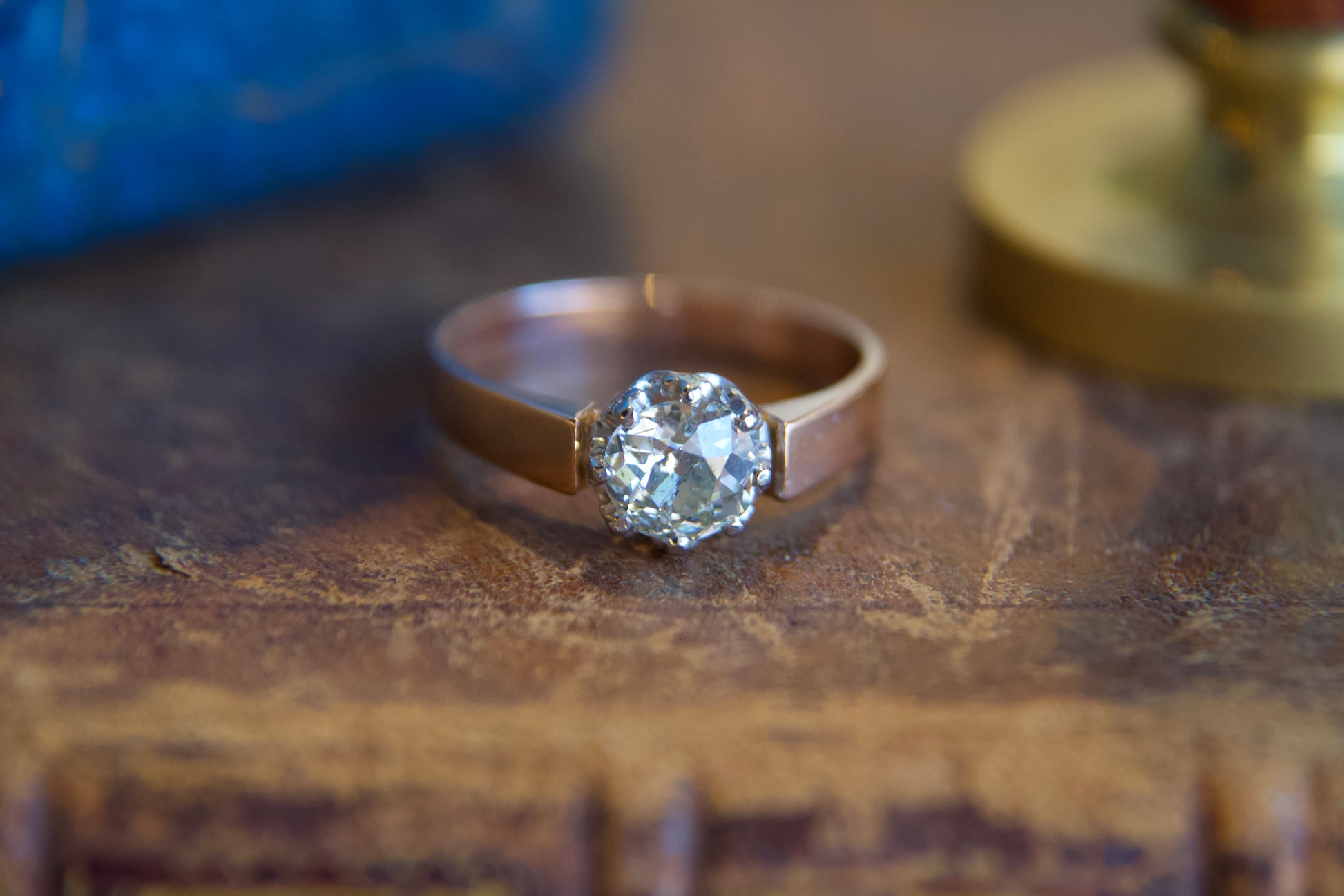 Questo straordinario solitario a cavallo tra fine '800 e primi '900 è un inno alla luce autentica e alla materia. La montatura in oro 18kt e platino punta tutto su un design solido e scultoreo, culminando in un castone a "corona" che solleva e celebra un diamante taglio antico da 0,92ct. A differenza dei tagli moderni, questa gemma vibra di una luce profonda e magnetica, figlia di una sfaccettatura eseguita interamente a mano che rende ogni riflesso unico e irripetibile. L'incontro tra il calore dell'oro e la fredda eleganza del platino crea un contrasto nobile, perfetto per chi cerca un simbolo di eternità lontano dall'omologazione contemporanea.